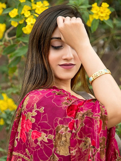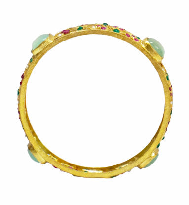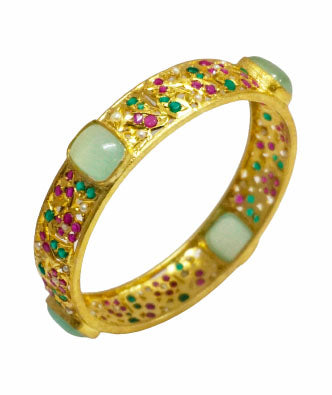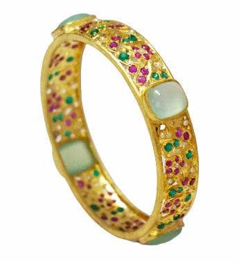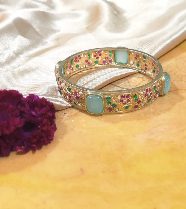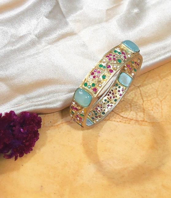 Exclusively handcrafted in Silver this bangle is set with Imitation stone. Embodied with traditional sawing craft it is ethnic and royal.
