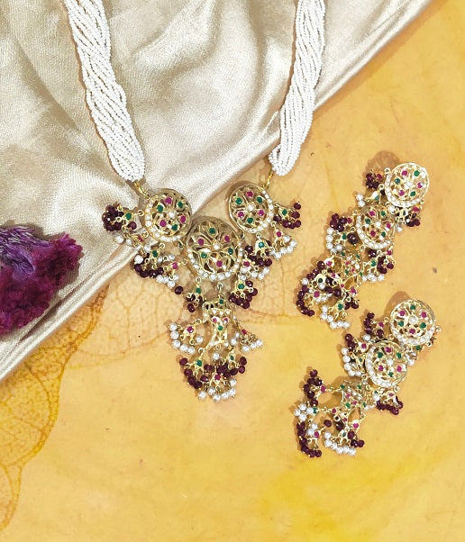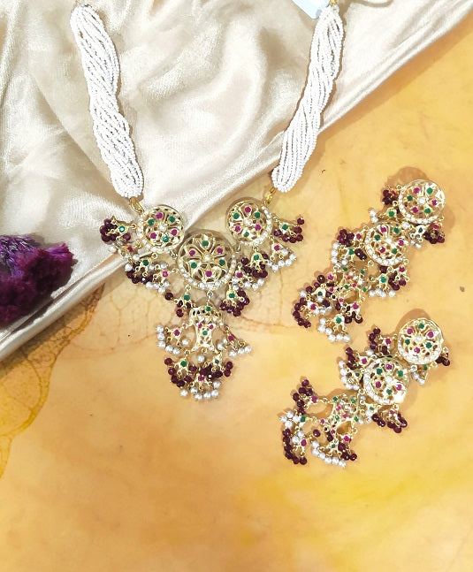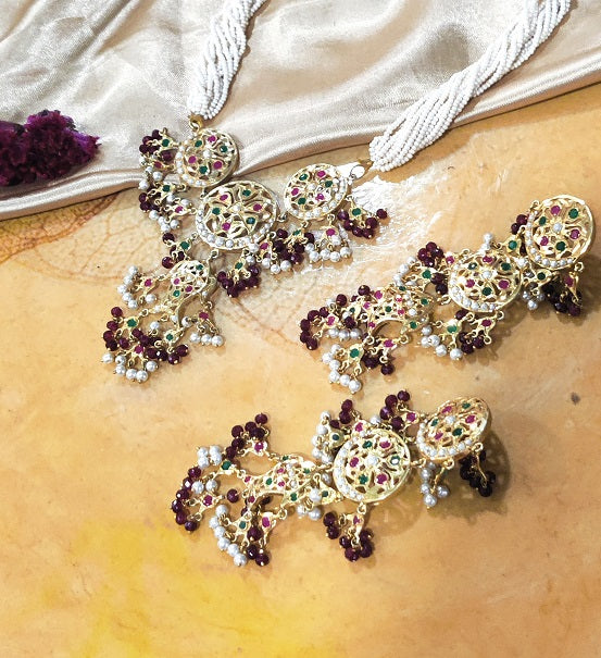 Encrusted with Imitation stones the set is handcrafted in Silver. The beautiful sawing work brings out the ethnic feel.