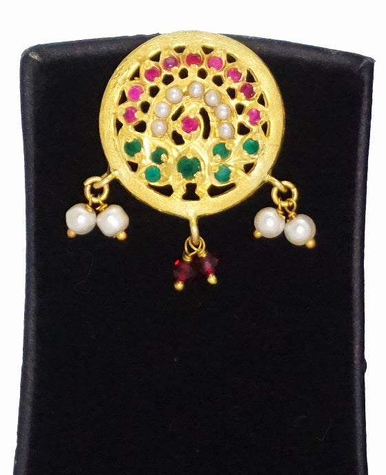 Encrusted with Imitation stones the set is handcrafted in Silver. The beautiful sawing work brings out the ethnic feel.