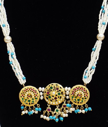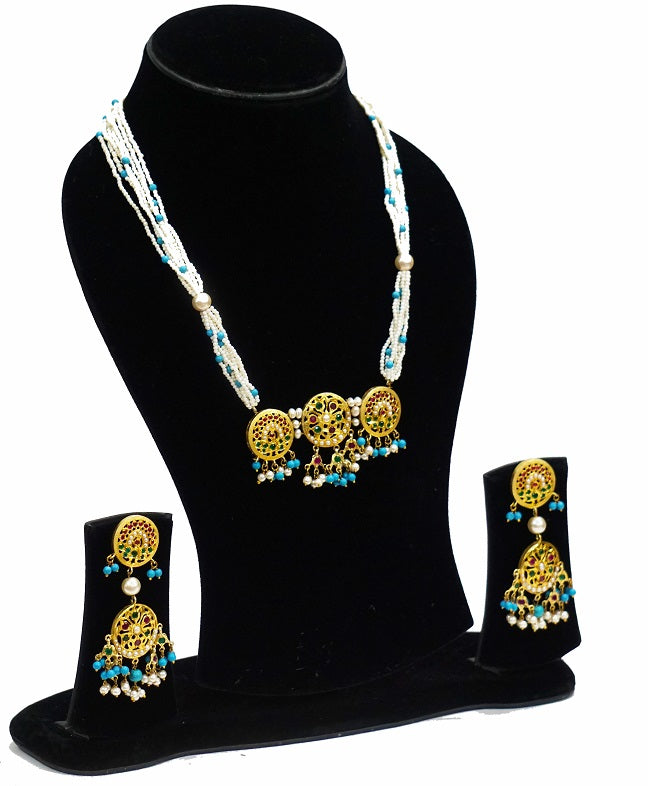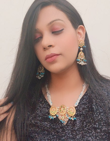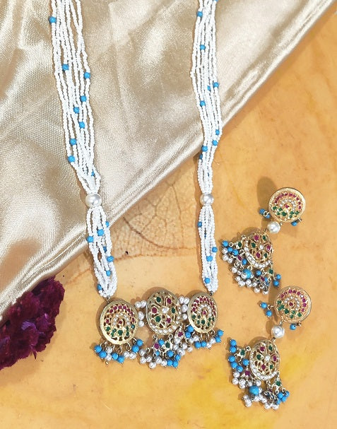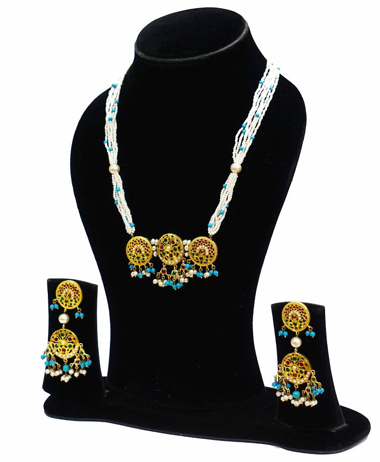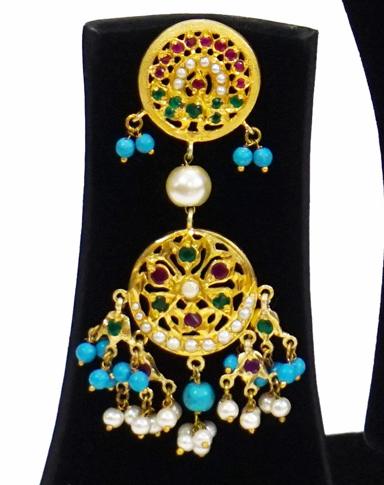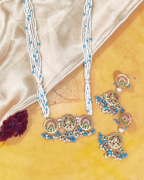 Encrusted with Imitation stones the set is handcrafted in Silver. The beautiful sawing work brings out the ethnic feel.