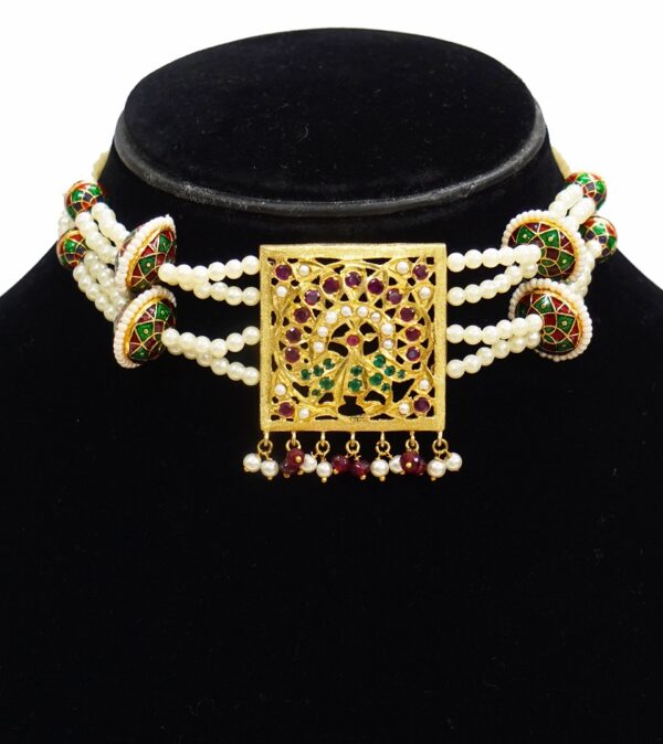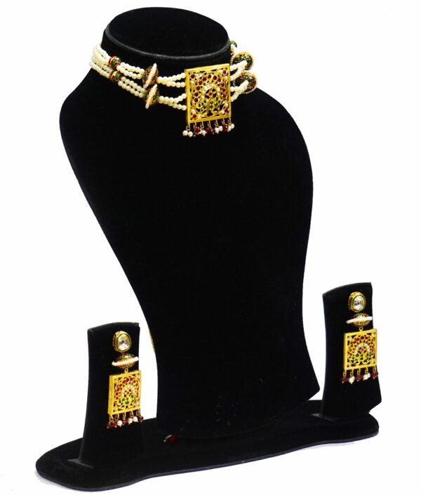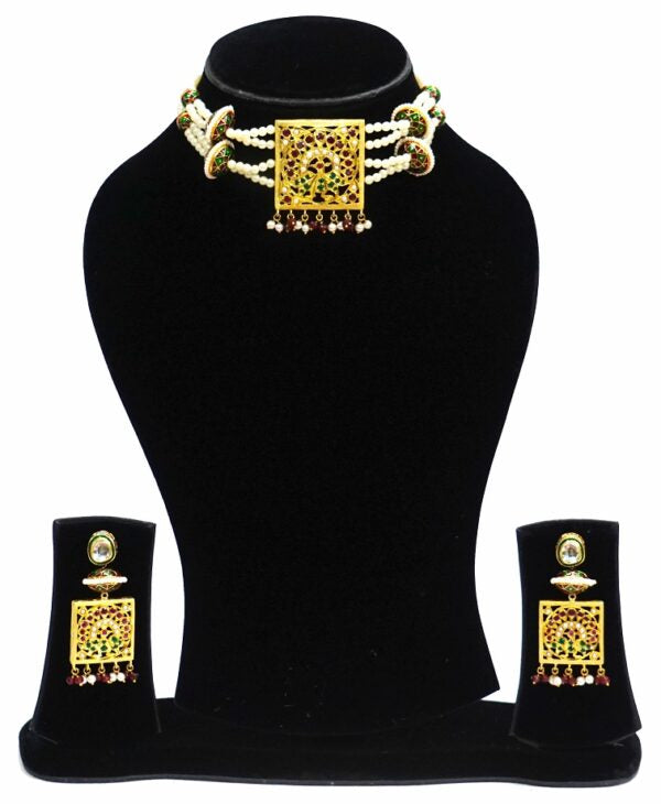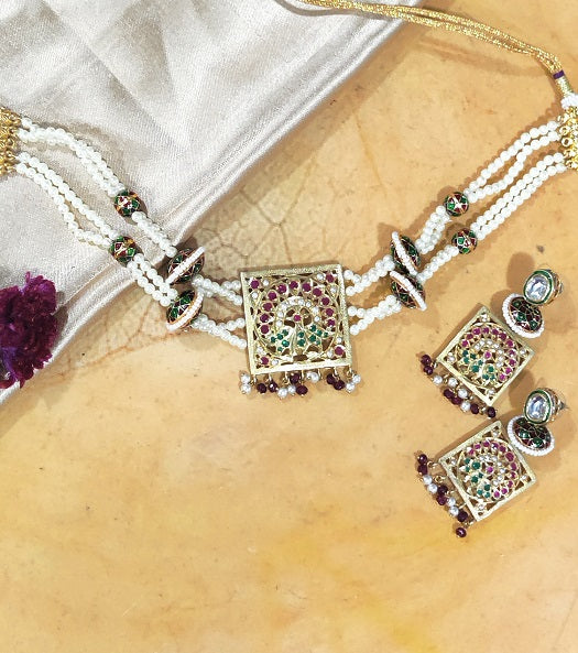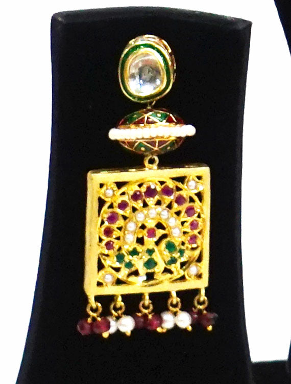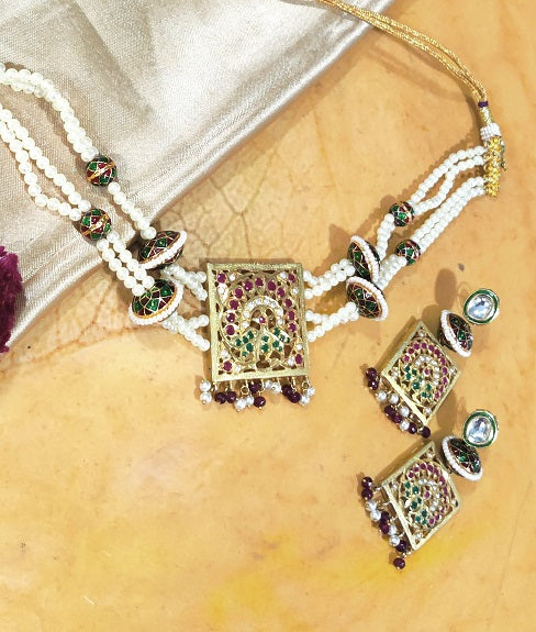 Encrusted with Imitation stones the set is handcrafted in Silver. The beautiful sawing work brings out the ethnic feel.