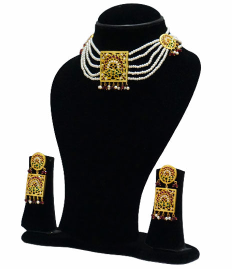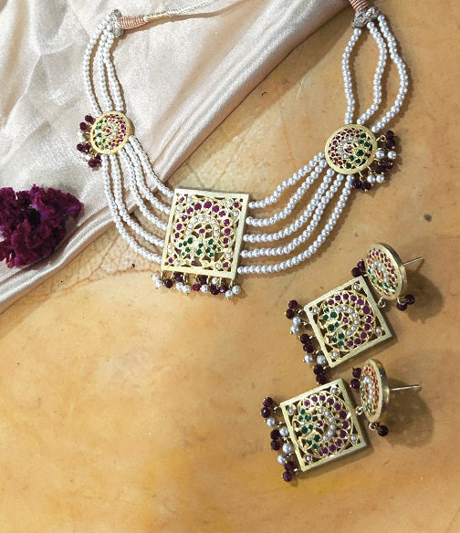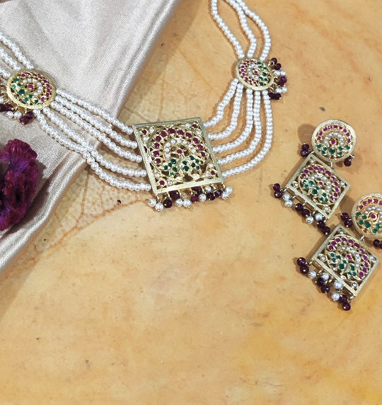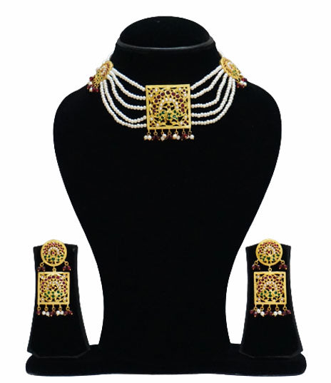 Encrusted with Imitation stones the set is handcrafted in Silver. The beautiful sawing work brings out the ethnic feel.