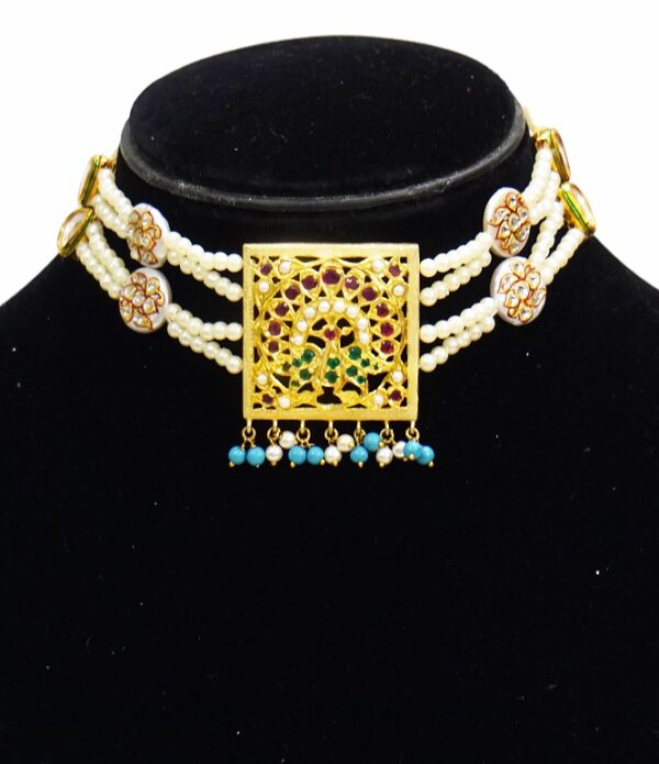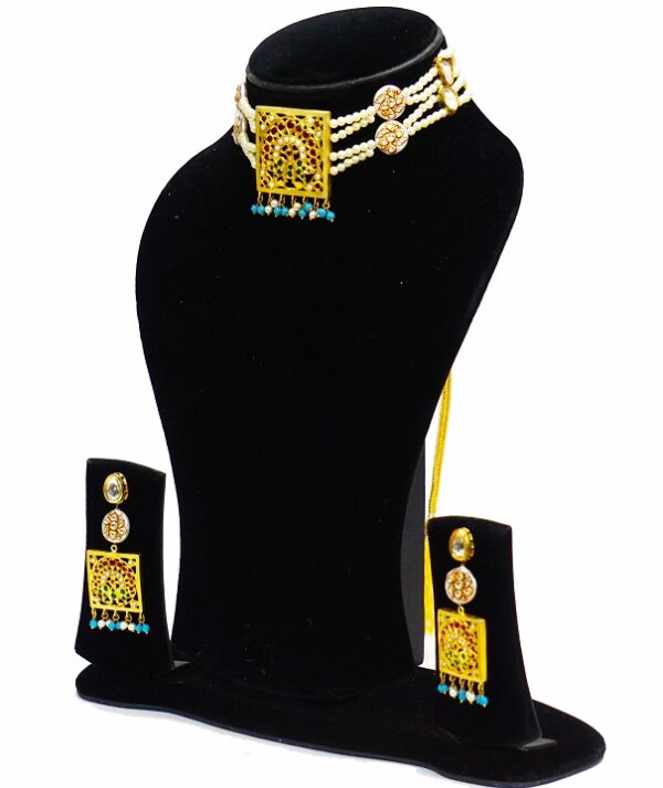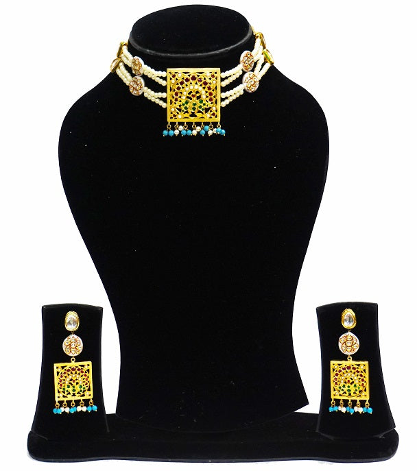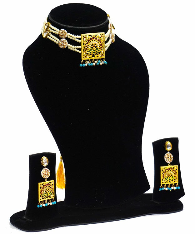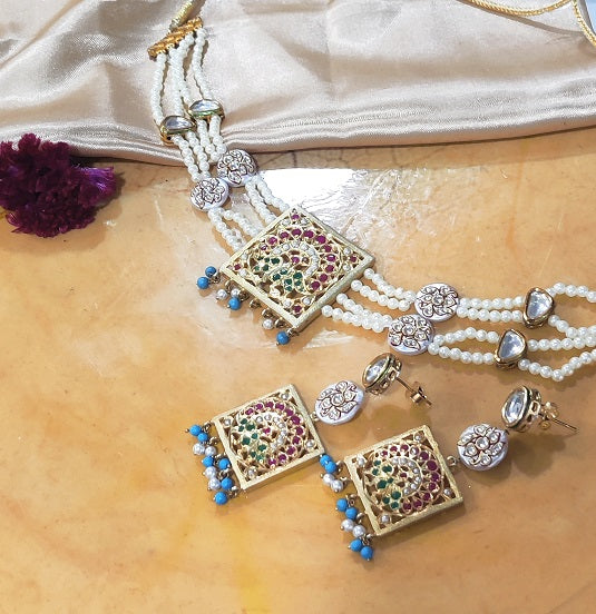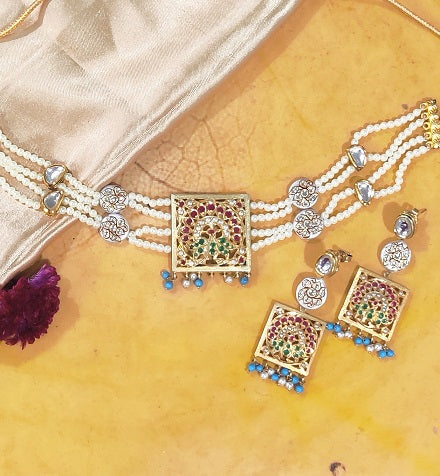 Encrusted with Imitation stones the set is handcrafted in Silver. The beautiful sawing work brings out the ethnic feel.