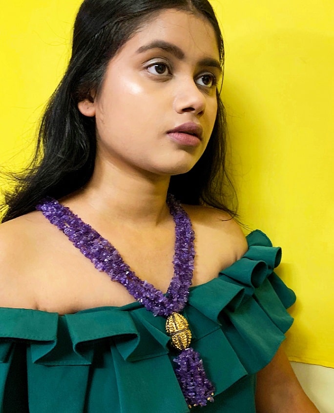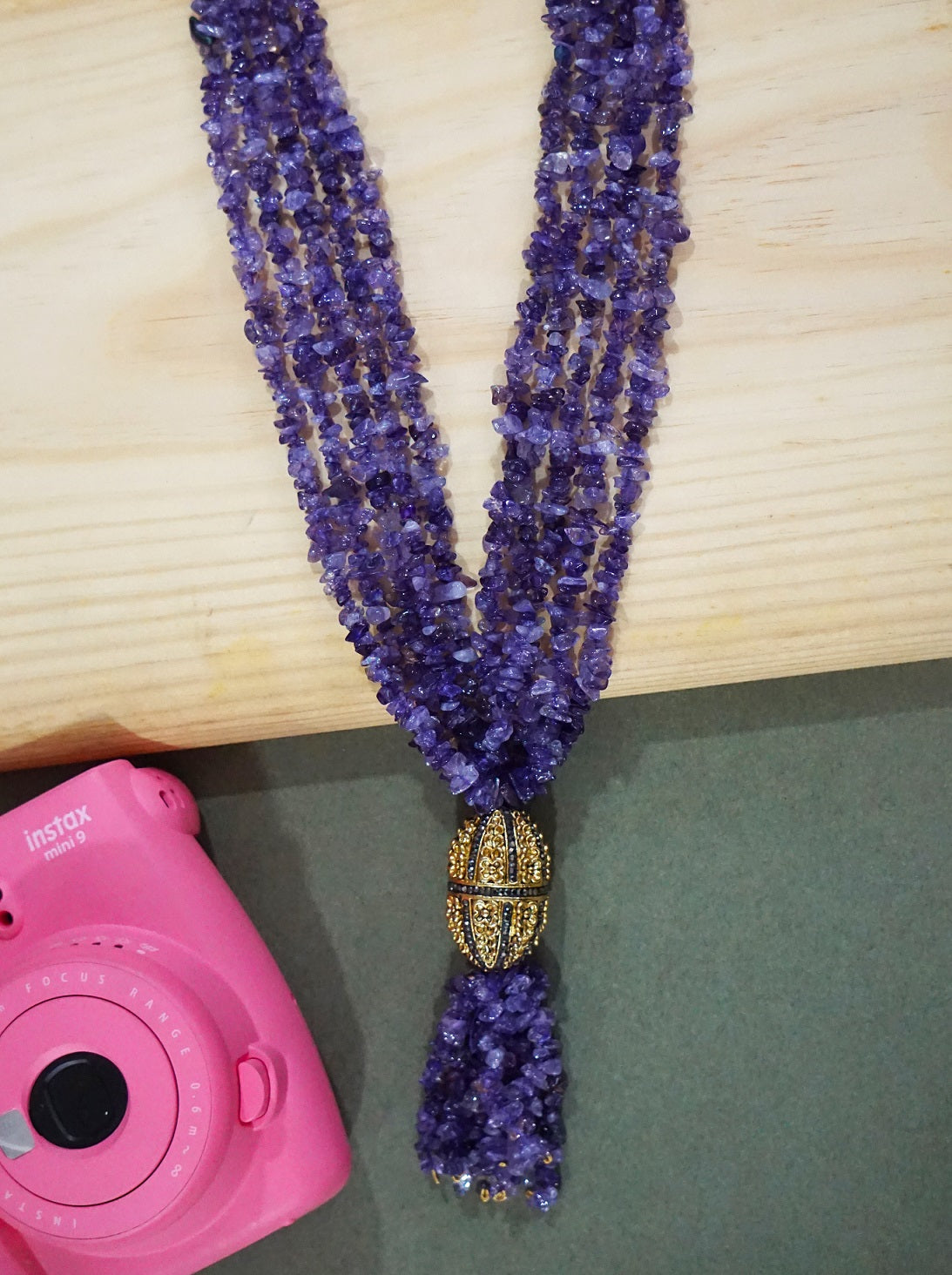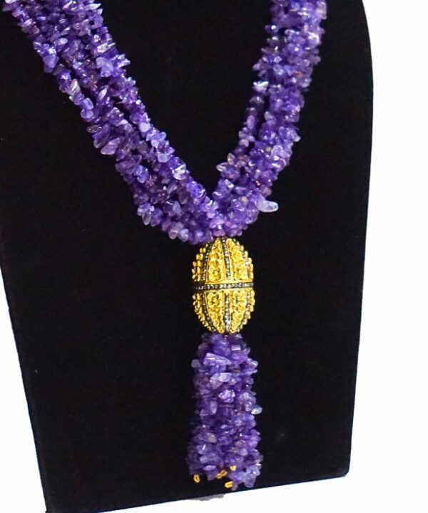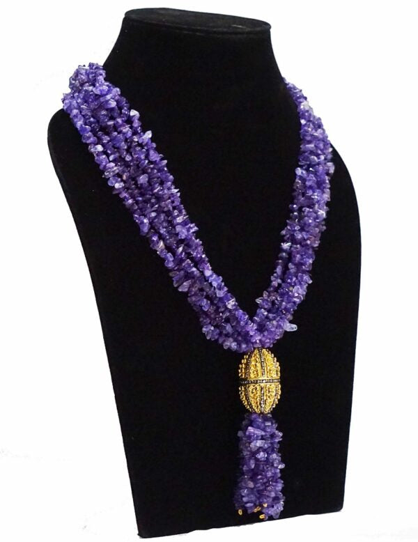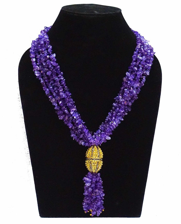 This chunky necklace is designed in tie style. The unique bead used is made with imitation stone and layered with gold.
