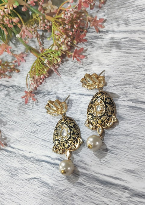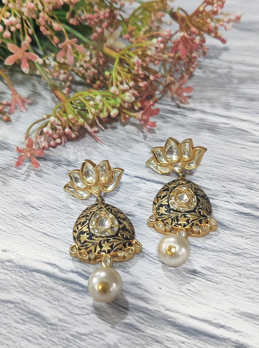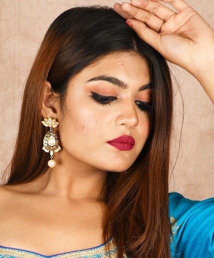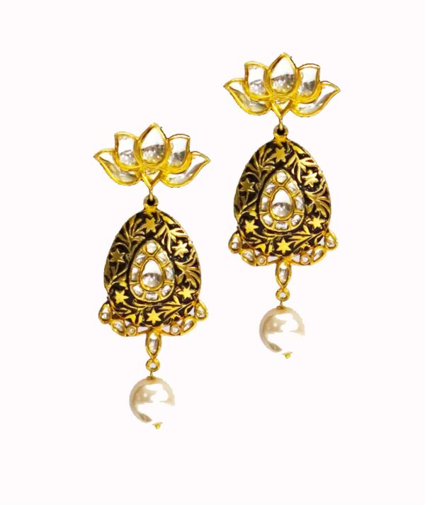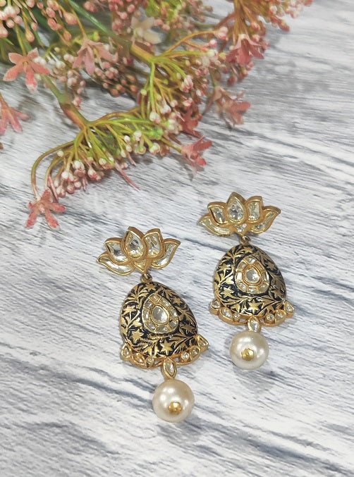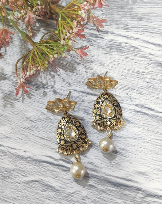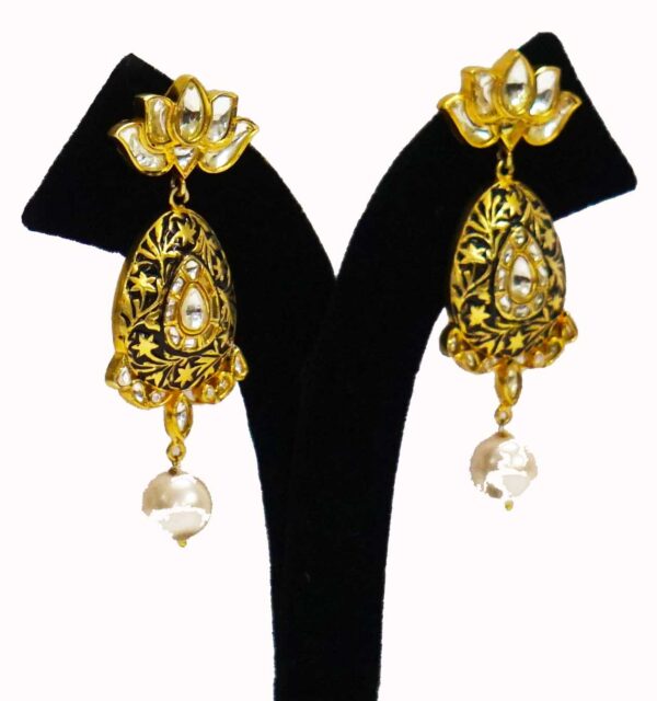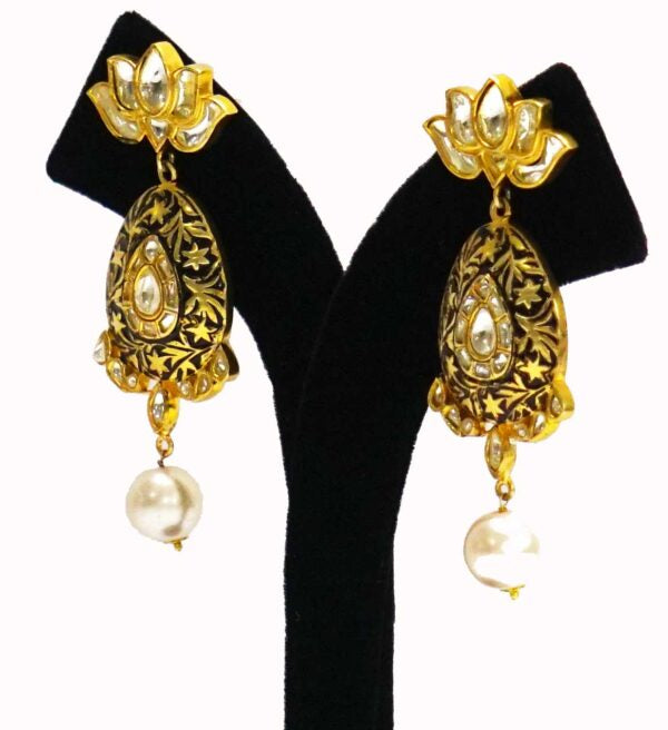 The uniqueness of this design lies in the fascinating shape of the pear and antique meenakari used together. Beautiful yet bold at the same time the two different elements compliment each other for a bridal look.