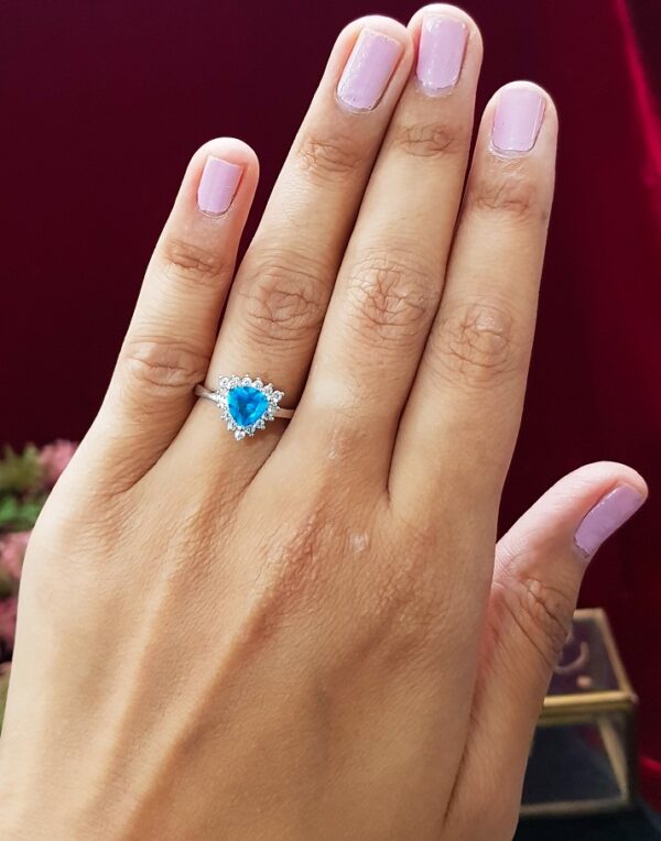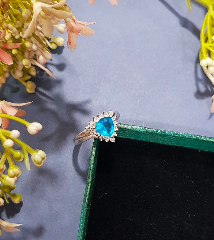 Embellished with imitation stones this Aquamarine Cushion Ring is a complete delight. Crafted in Silver it has a high class appeal.