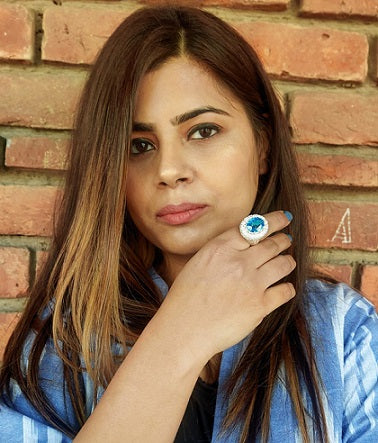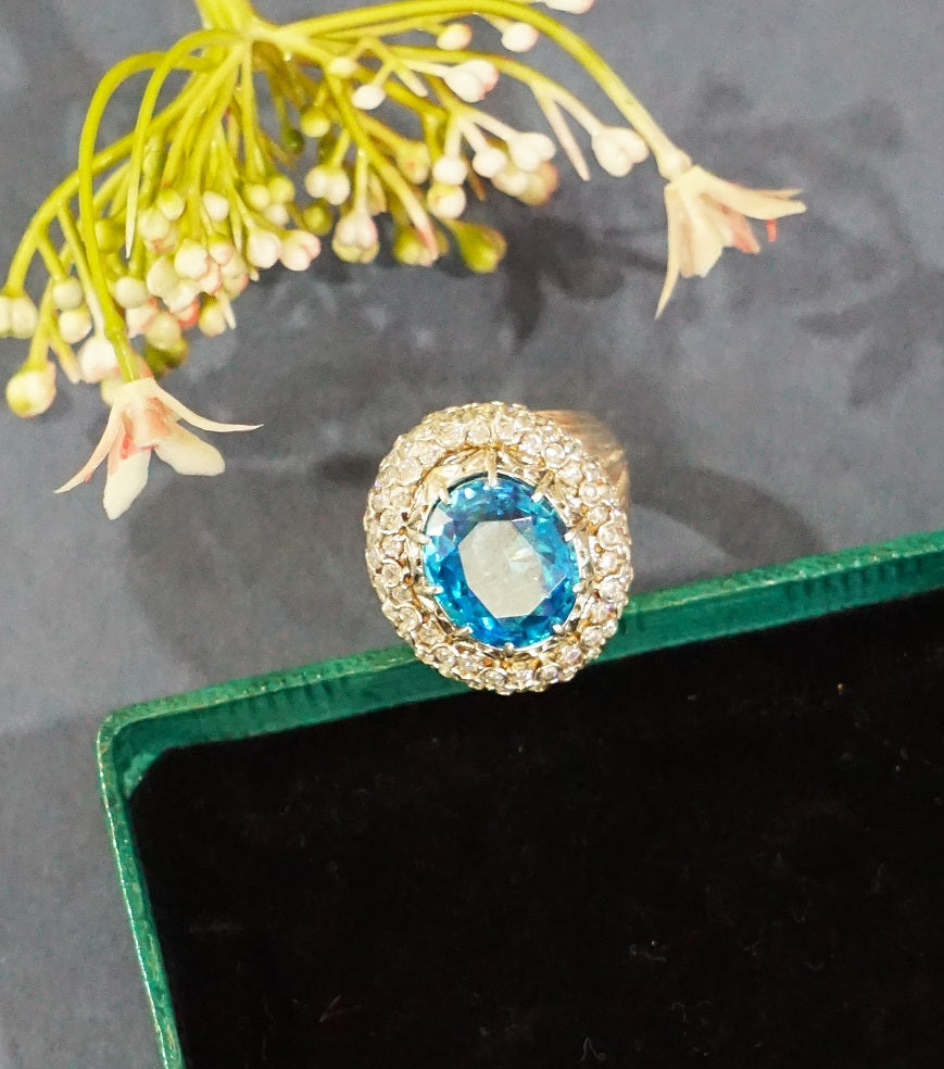 Encrusted with imitation stone this Ring is handcrafted in silver. The simple classic cocktail ring.