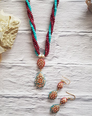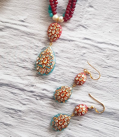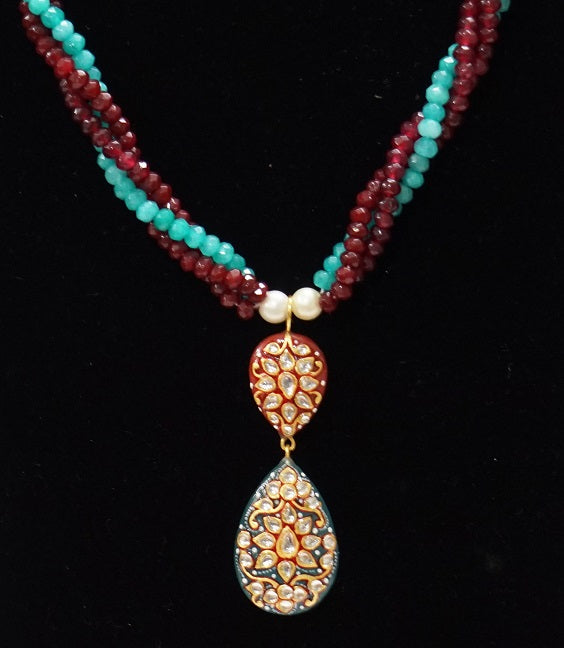 Encrusted with hand painted work Aquamarine & Red Onyx is set in Silver. The exquisite blend of colors makes it a must-have.