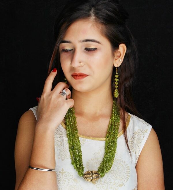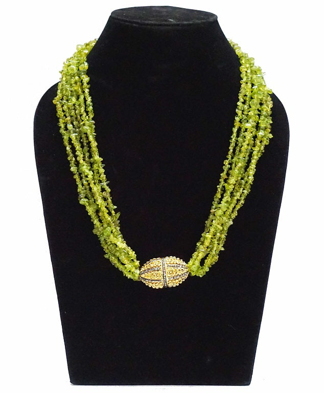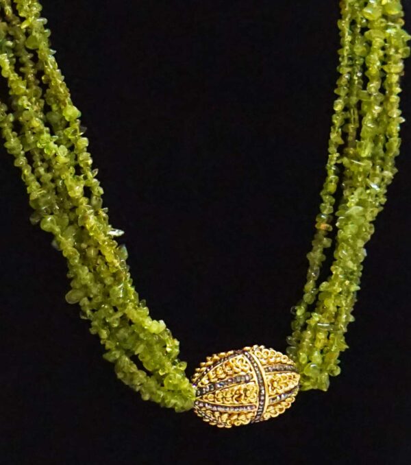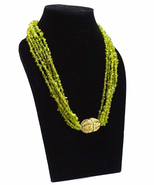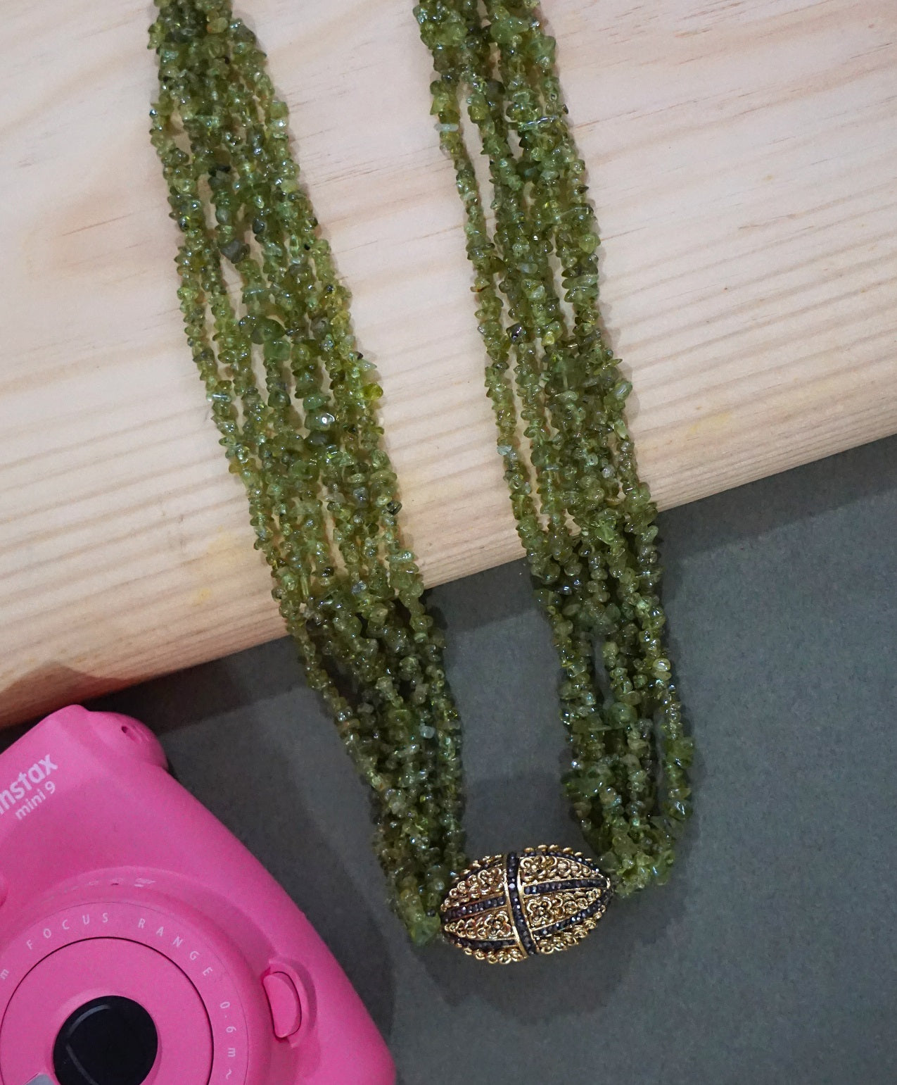 This chunky necklace is designed in opera style. The unique bead used is made with imitation stone and layered with gold.
