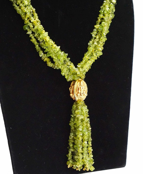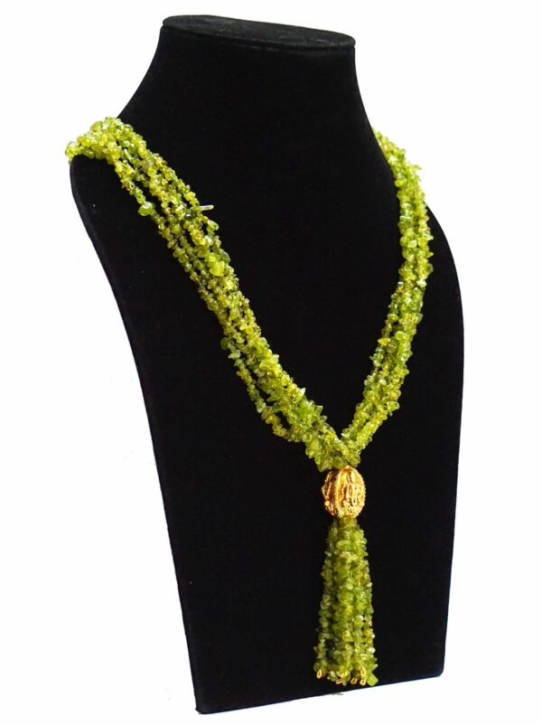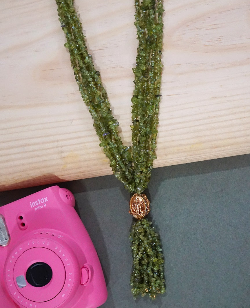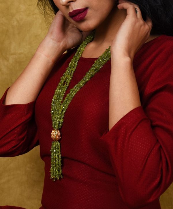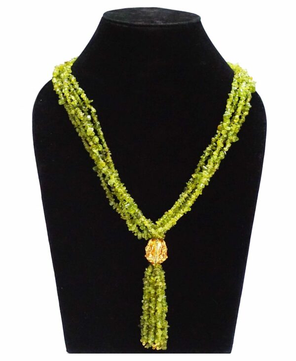 This chunky necklace is designed in opera style. The unique bead used is made with imitation stone and layered with gold.