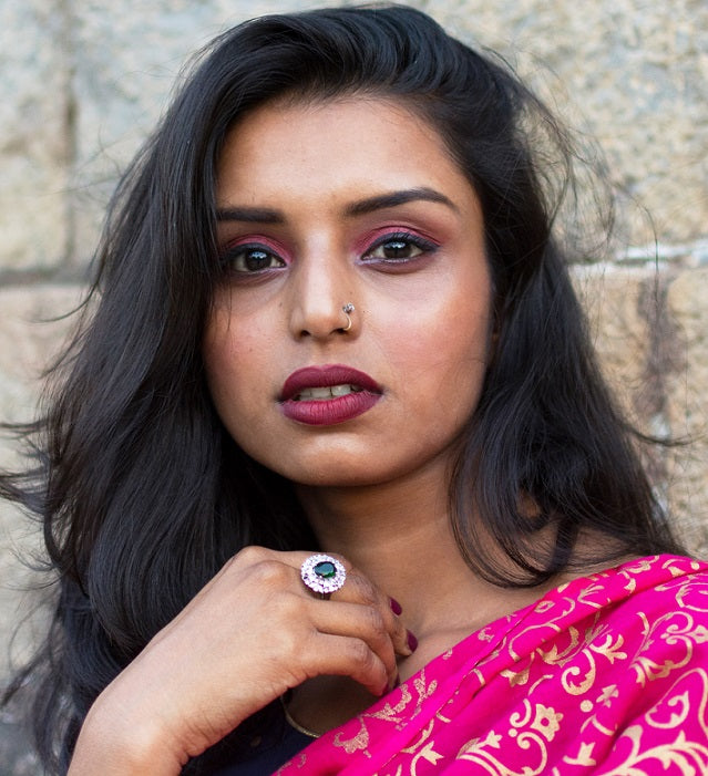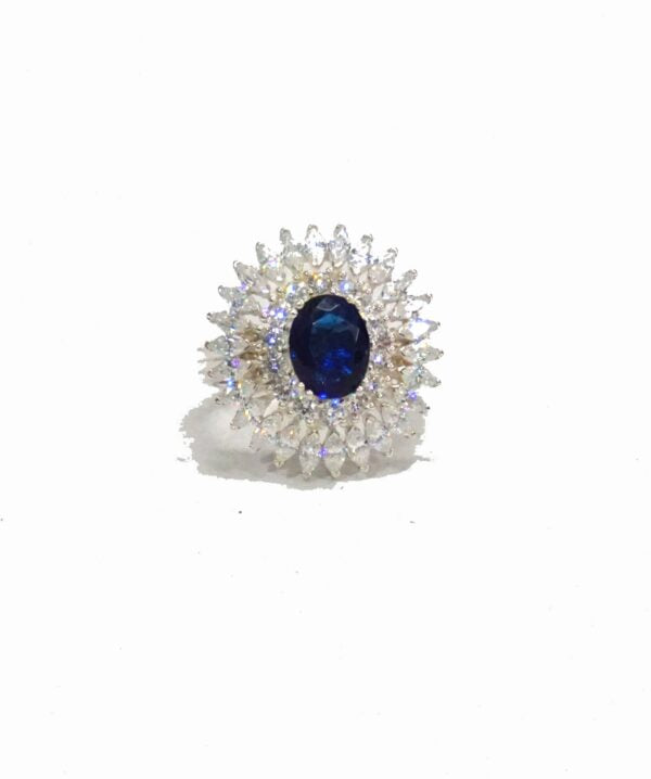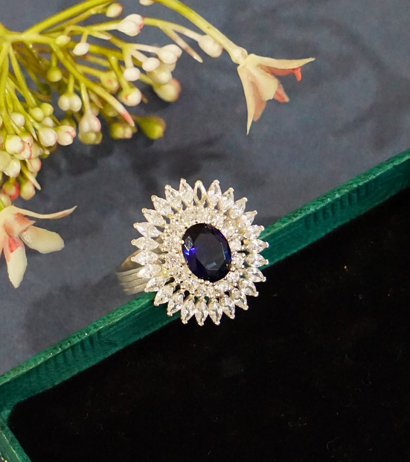 Encrusted with imitation stone this Ring is handcrafted in silver. The simple classic cocktail ring.