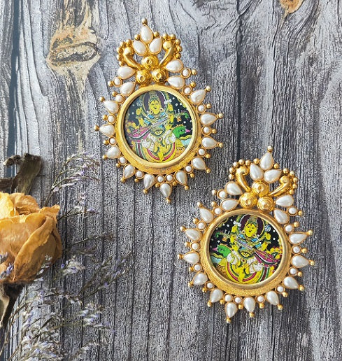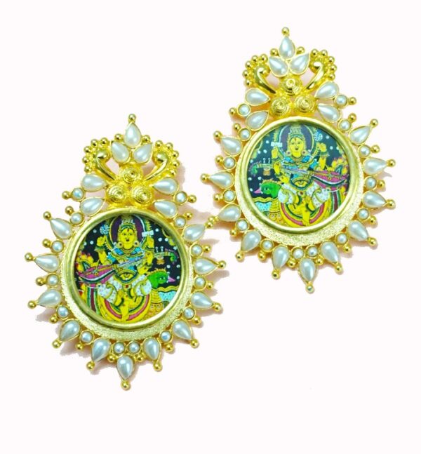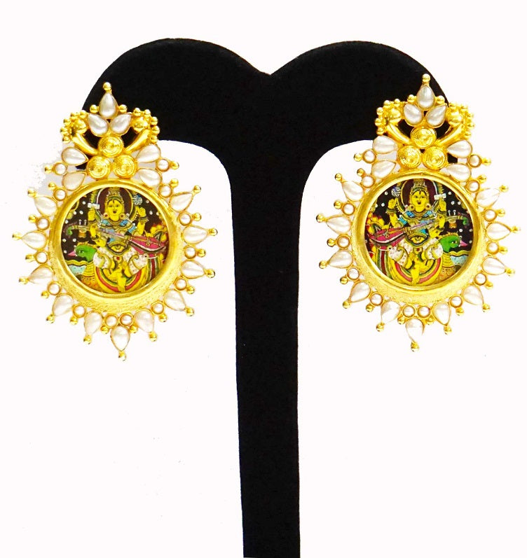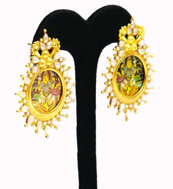 The depiction of Devi shows women’s power. Beautifully worked Kundan chandbali with Devi’s portrait is all about this piece.