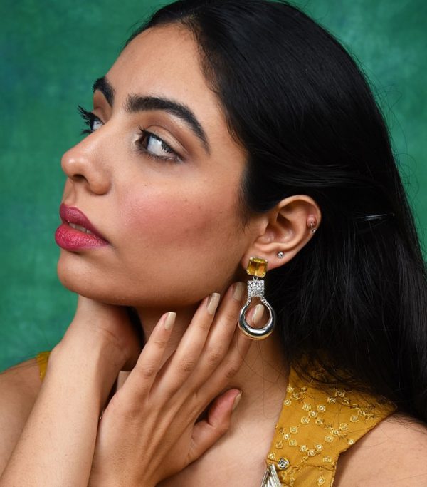 The blend of Citrine yellow and chand motif has a beautiful look to it. The simple and elegant design is all festive.