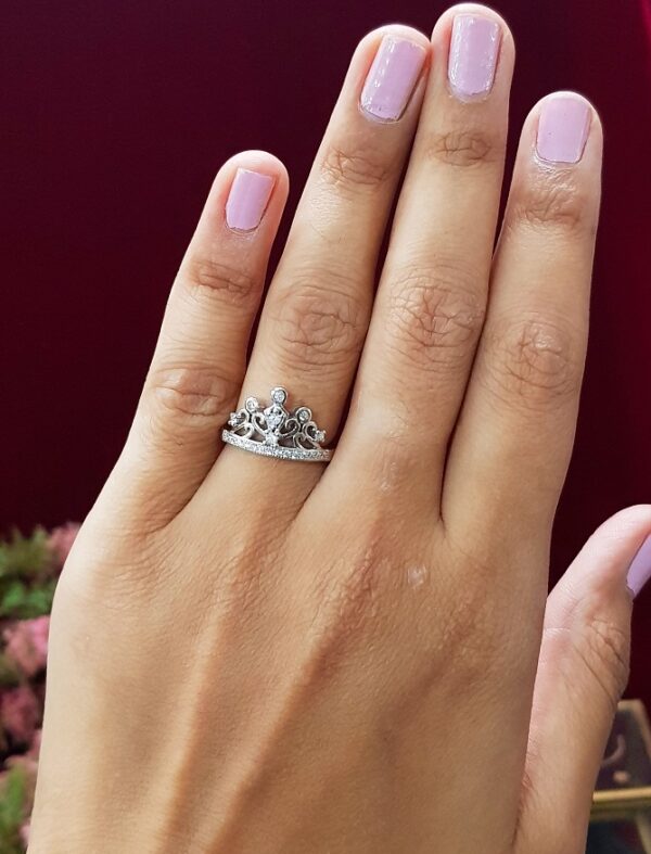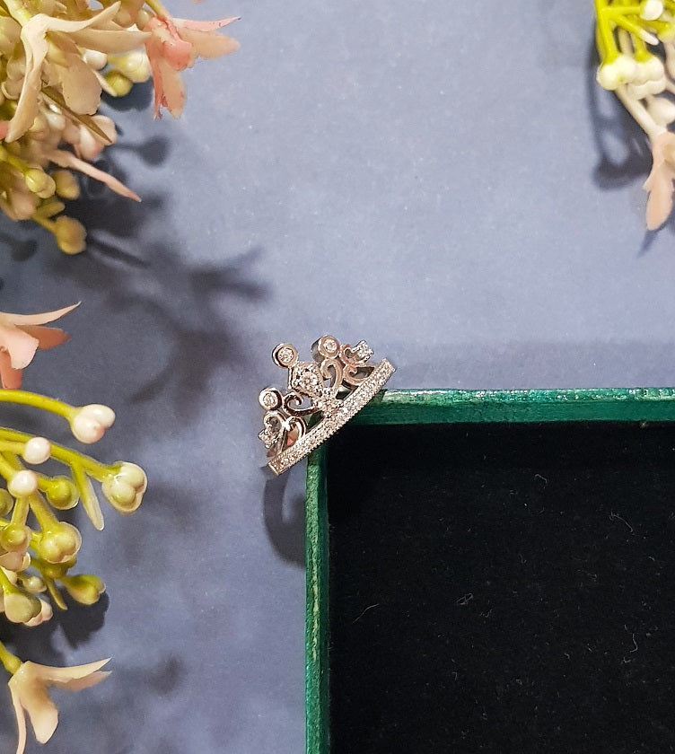 Embellished with imitation stones this Cocktail Crown Ring is a complete delight. Crafted in Silver it has a high class appeal.