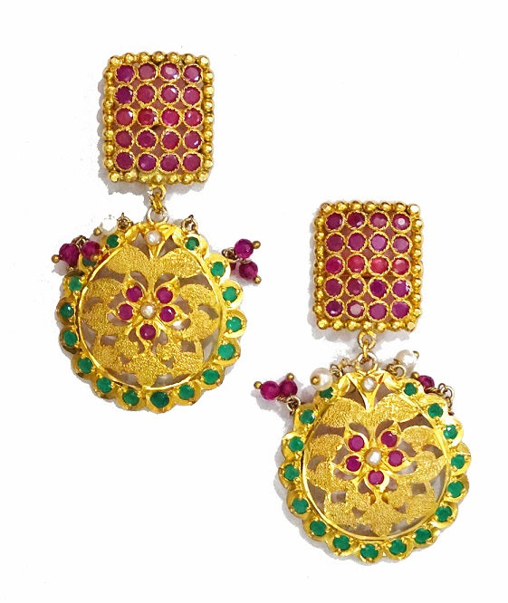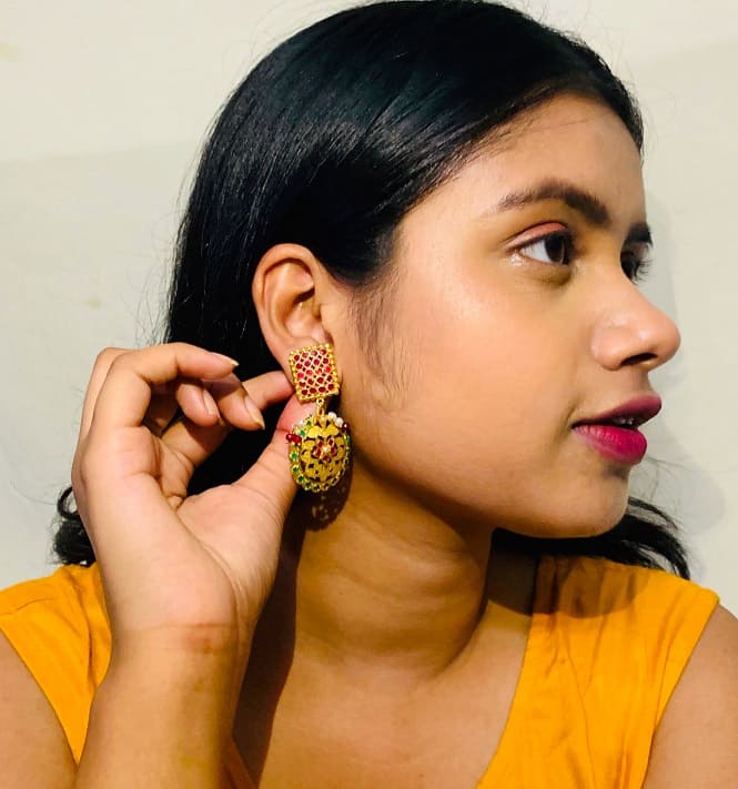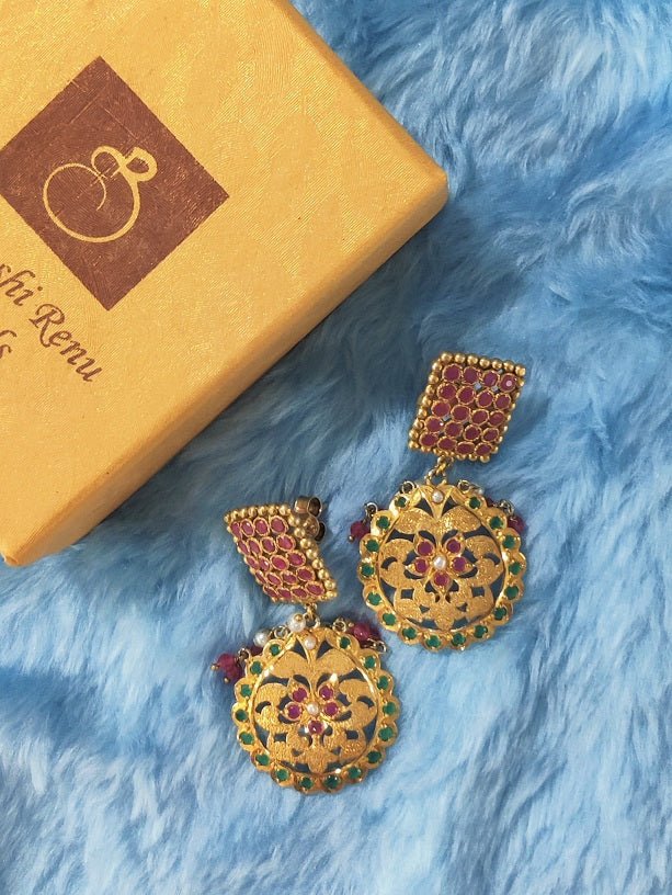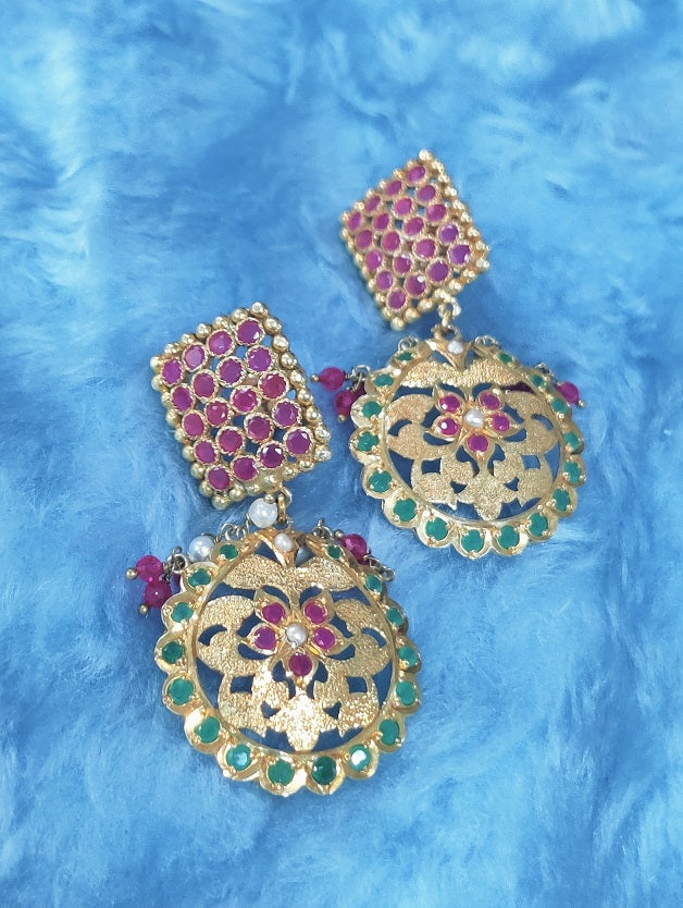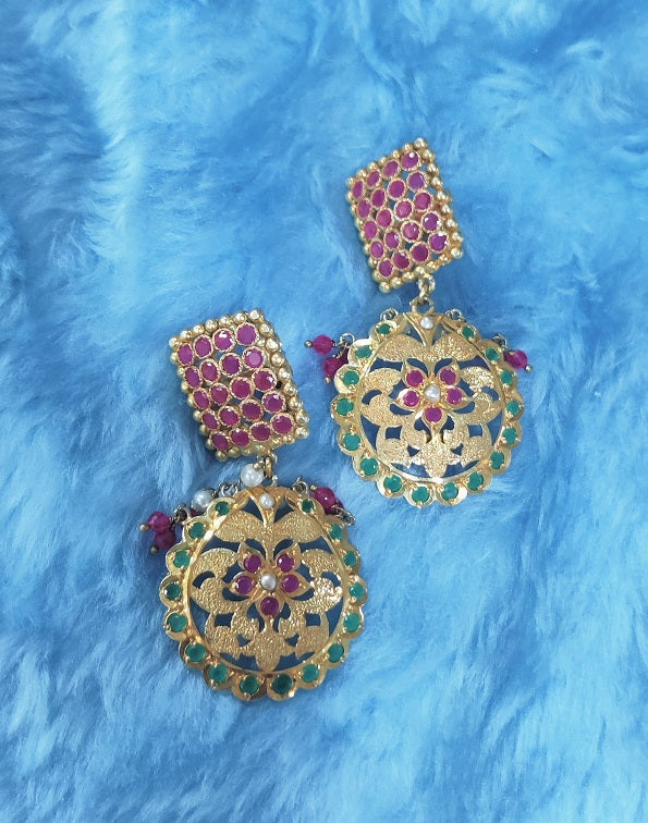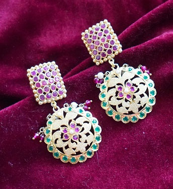 Handcrafted in silver this dangler is a fusion of Aari work and kundan setting. The combination of that makes it unique.