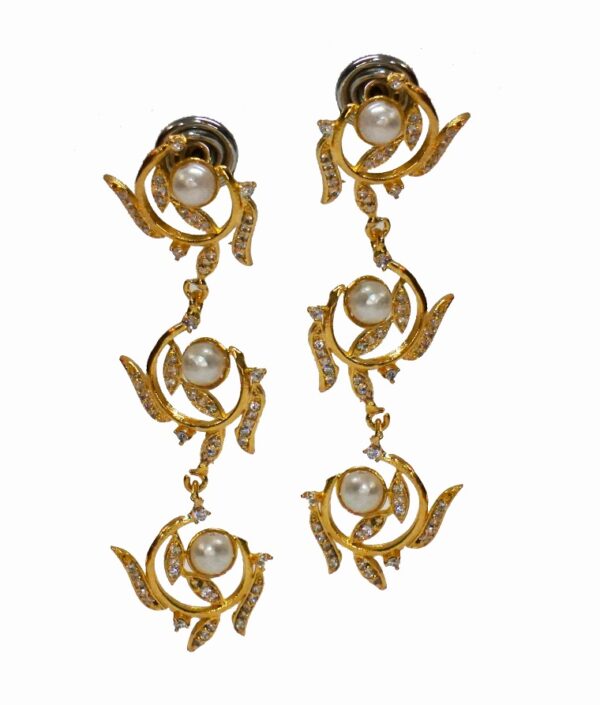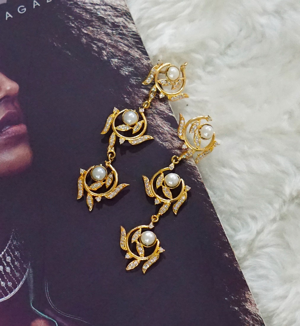 Set with flora motif all the way this gorgeous earring is an eye catcher. Handcrafted and embellished with pearls, imitation stones and gold polish.