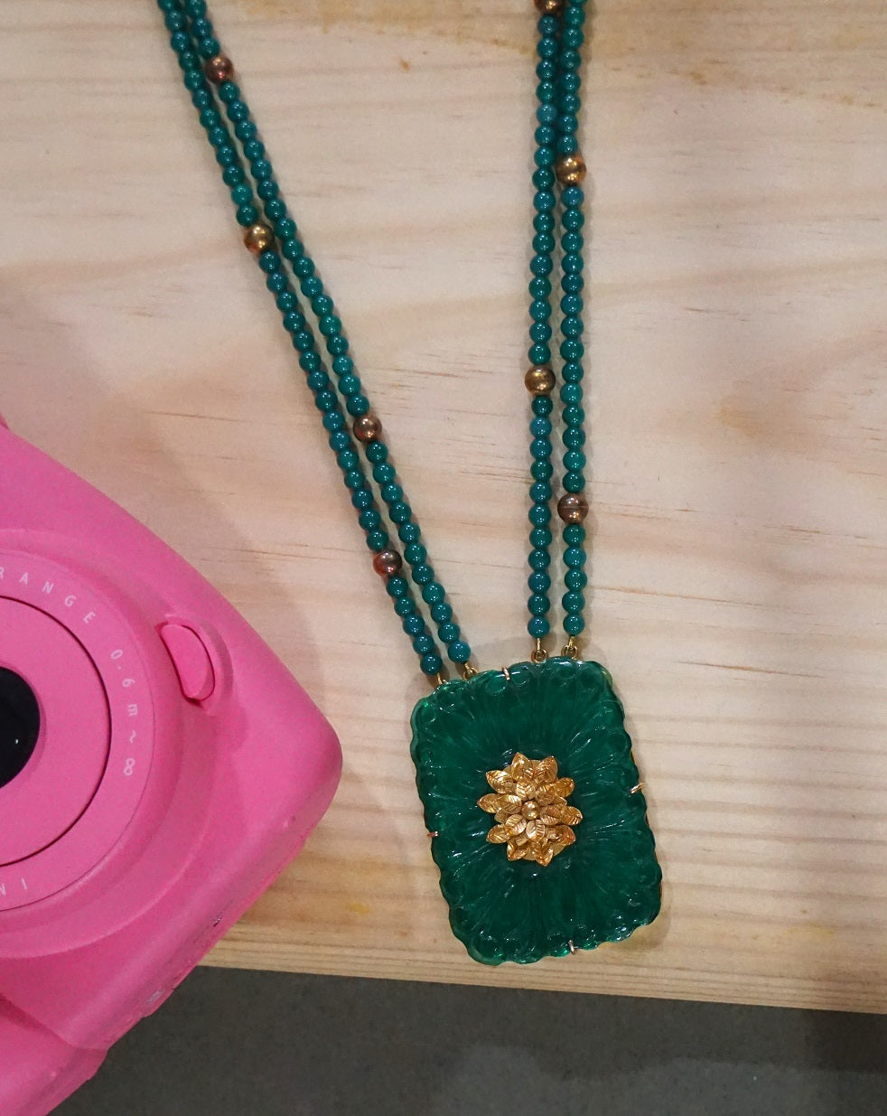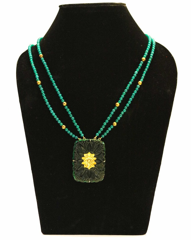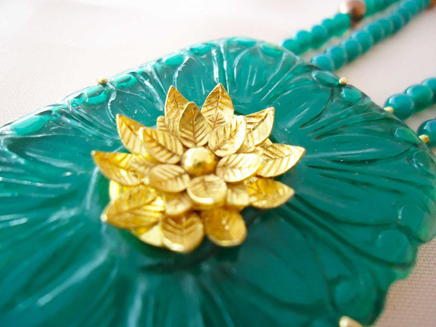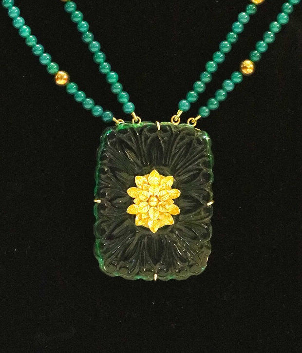 Elegantly carved this glass stone is encrusted with a gold flower. Intricate & aesthetic this flower has beautiful engraving that brings out detail.