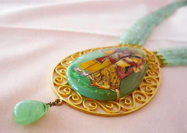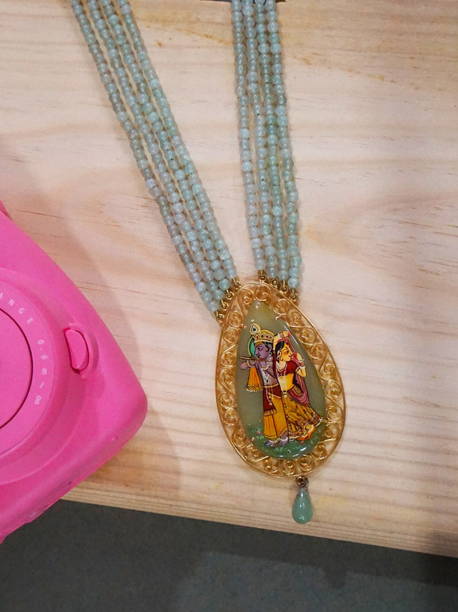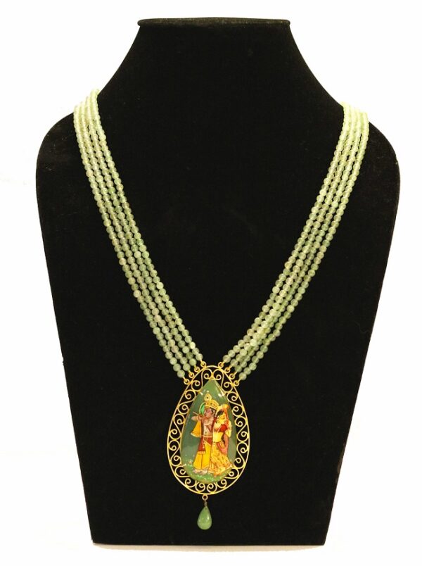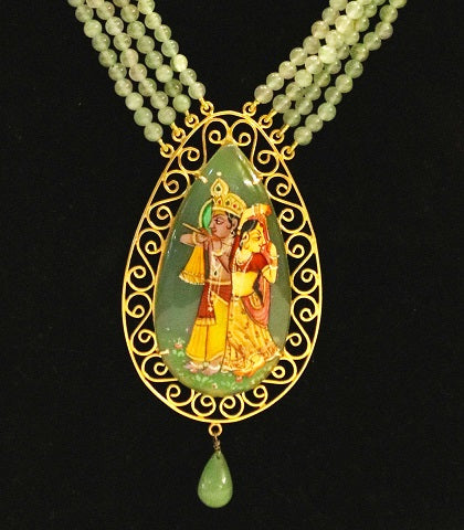 The hand painted Radha Krishna has a blissful touch. Complimenting the unique filgree the Aventurine green beads add a young charm.