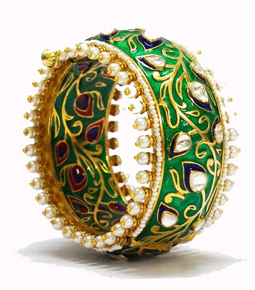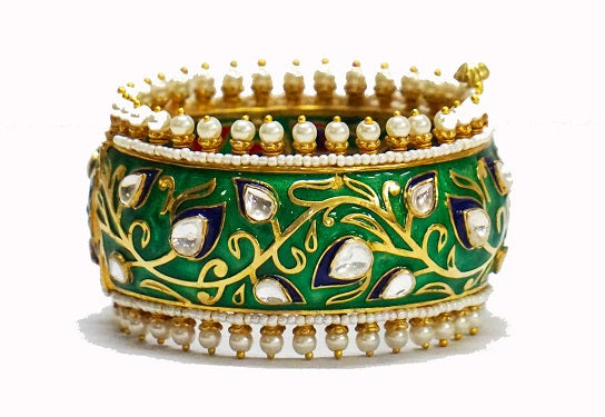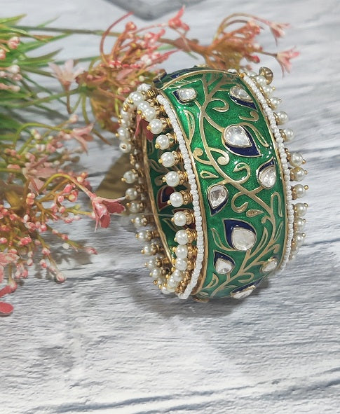 Embellished with green and blue meenakari and white polki this beautiful bangle is handcrafted in silver. Just the right fit for a bridal set.
