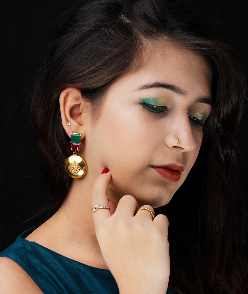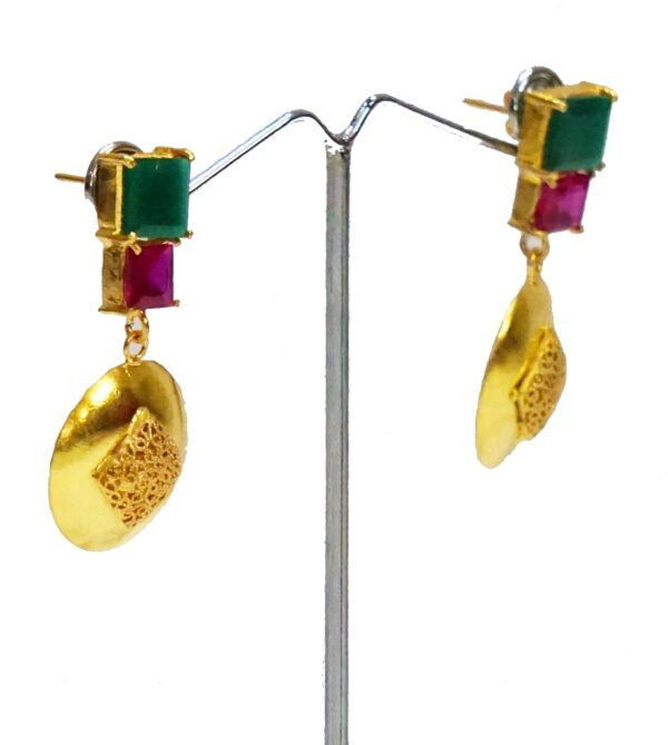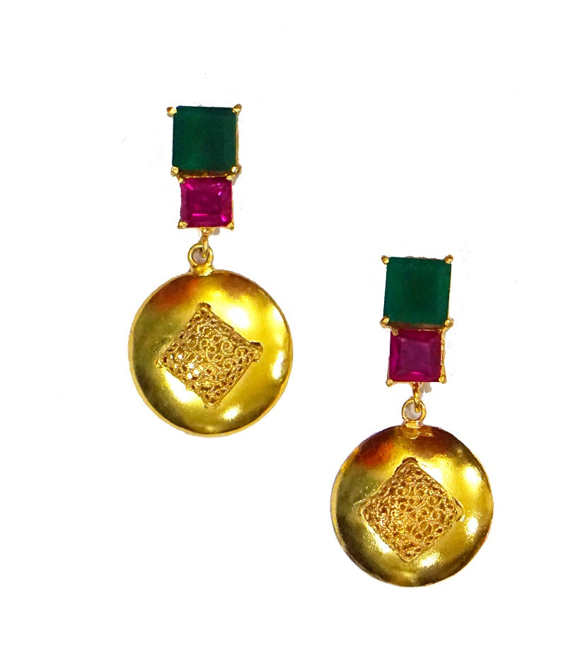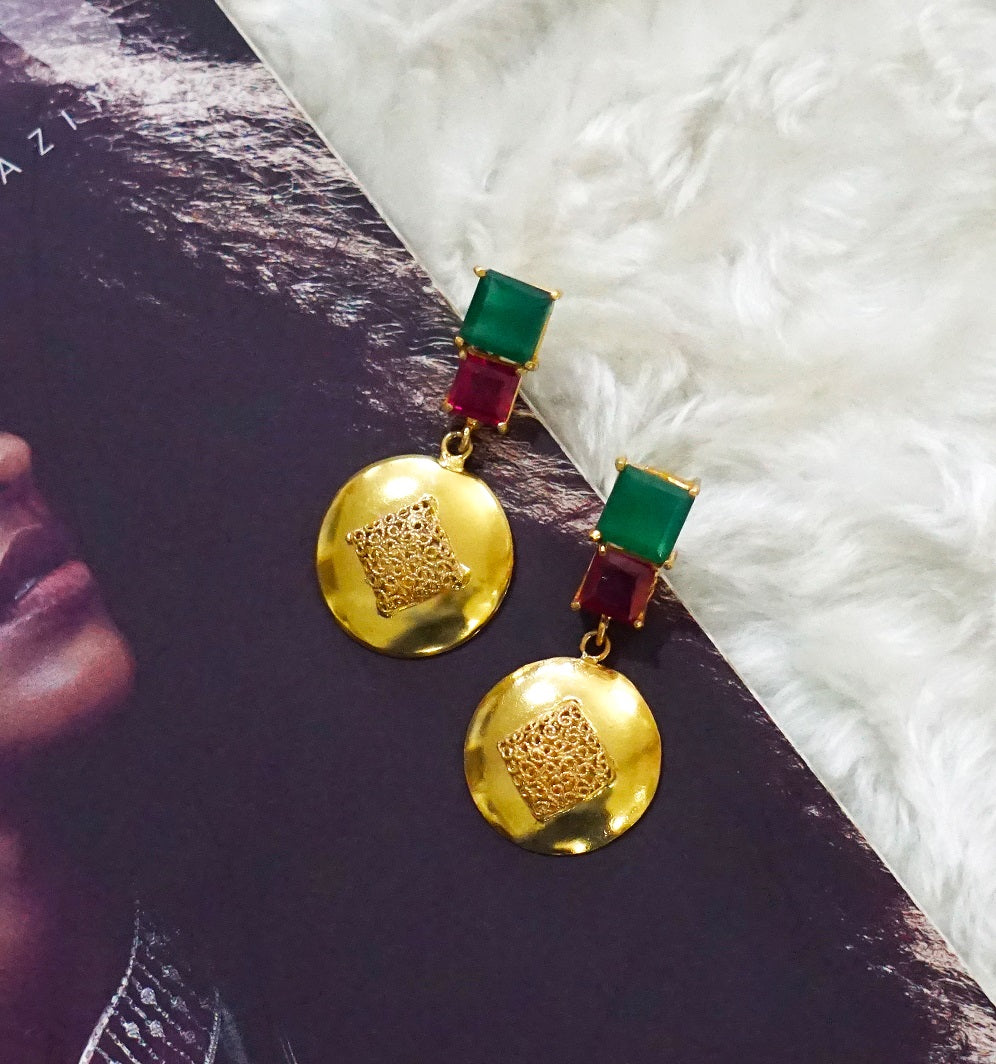 Handcrafted in brass, Green, and Red Stone dangles is embodied with a square filigree motif.