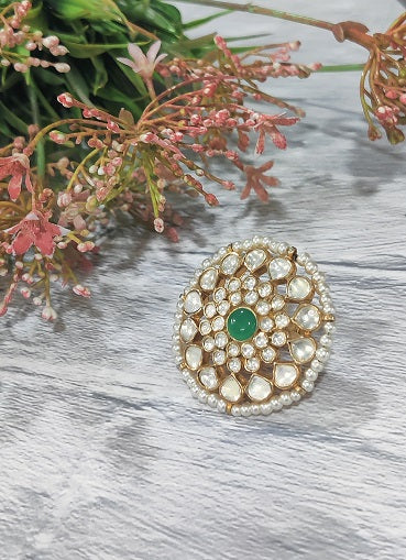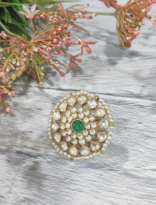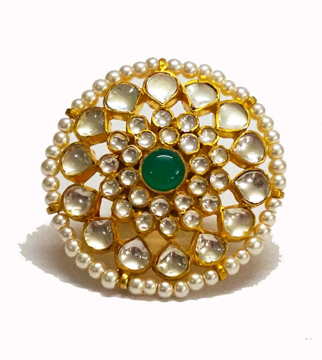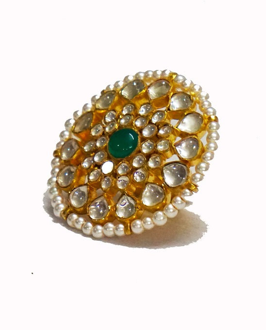 The brilliance of this Ring is the beautiful Emerald color complimenting the round shape and polki. A wedding trousseau cannot be complete without such a beauty.