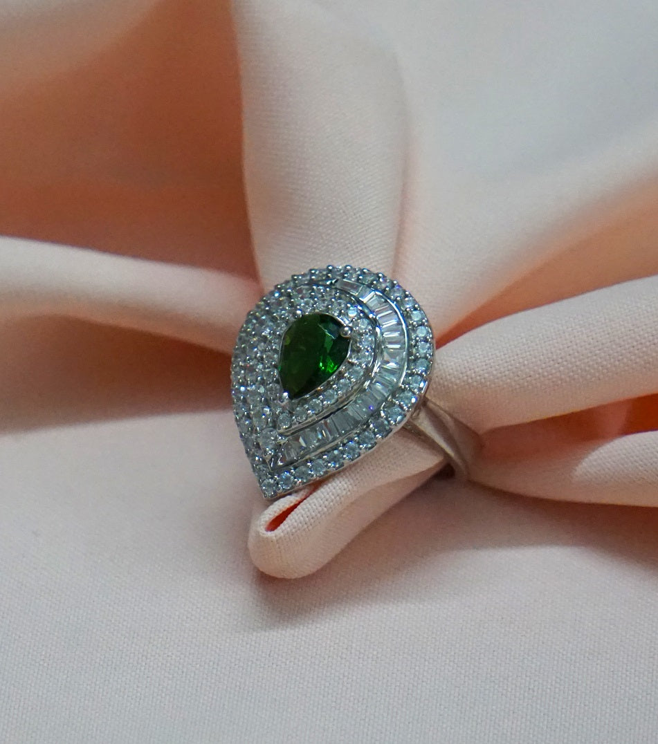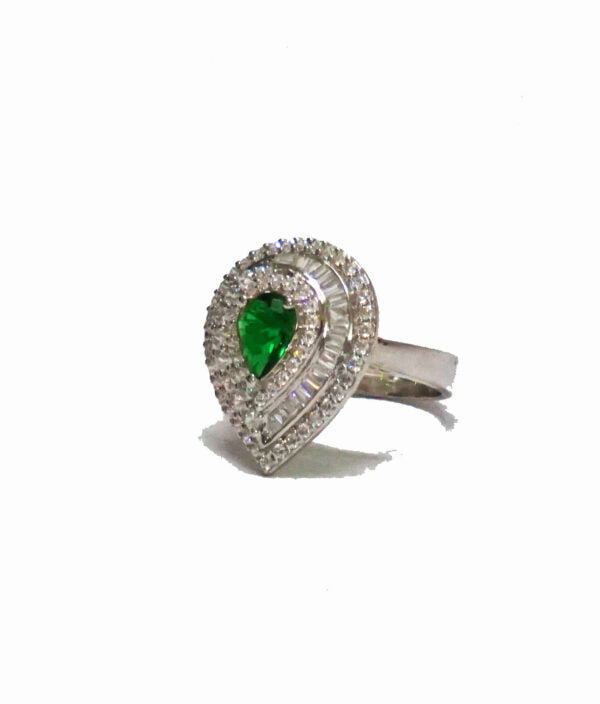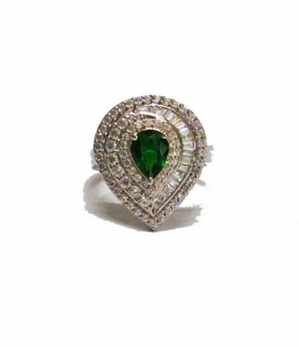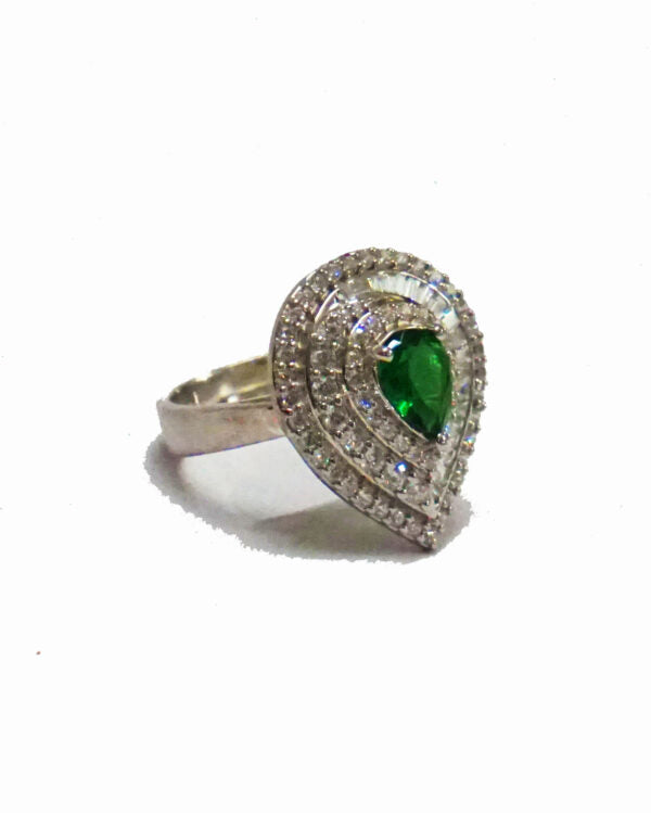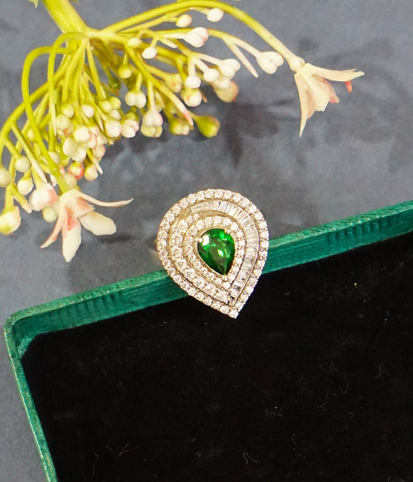Encrusted with Green imitation stone in the center this Ring is handcrafted in silver. The simple classic cocktail ring.