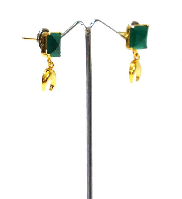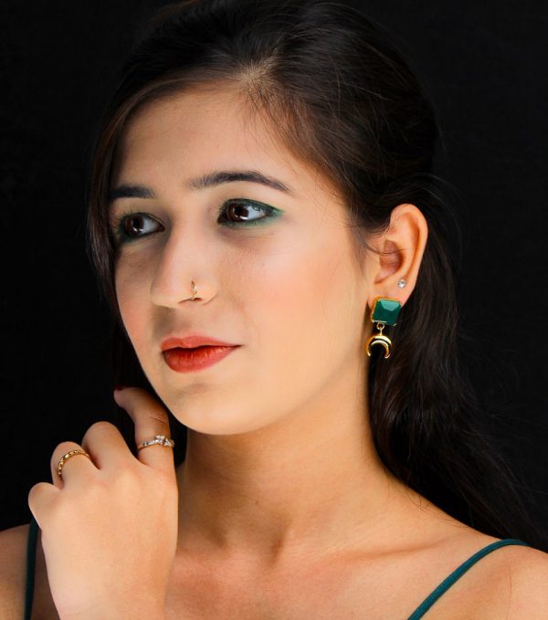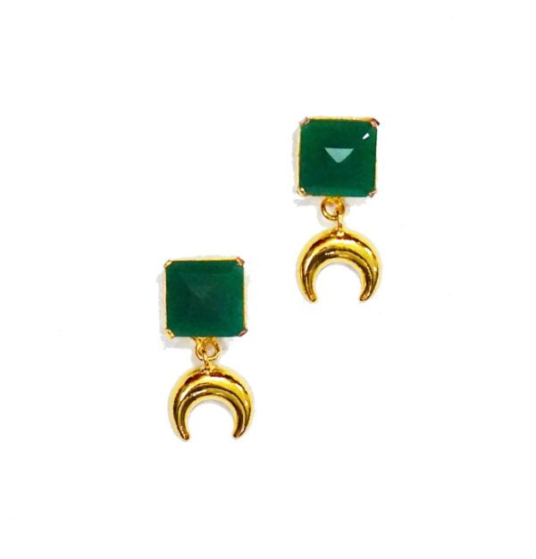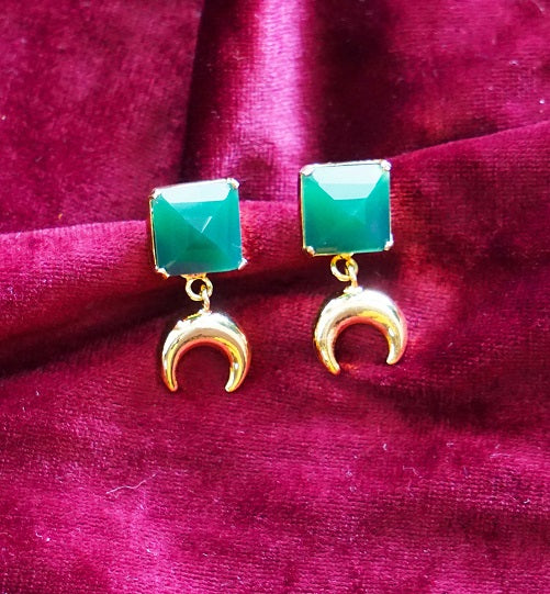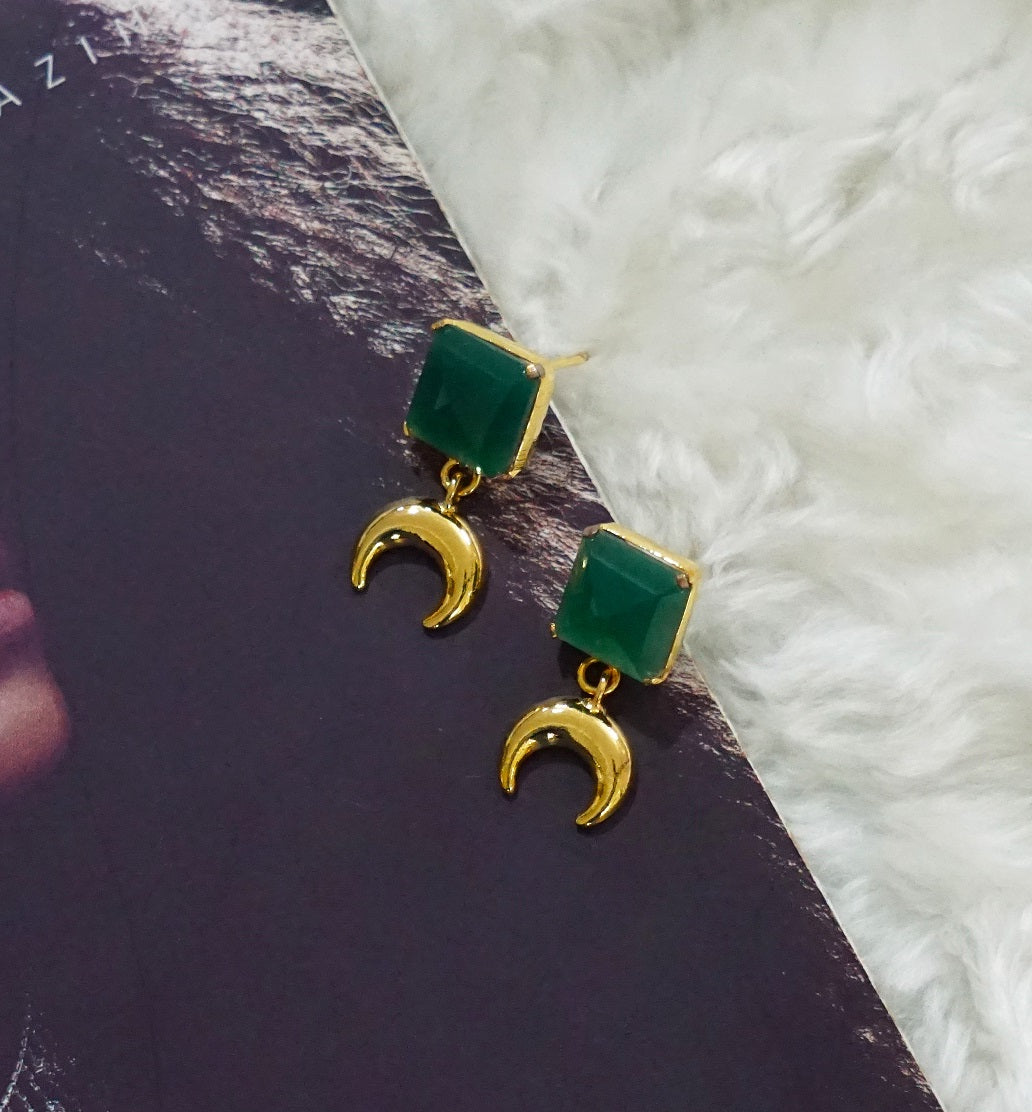 Greenstone set in brass and finished with a crescent dangler is a simple earring.