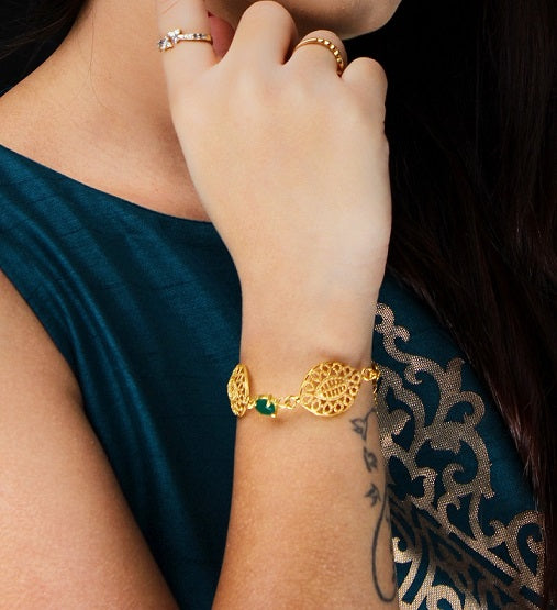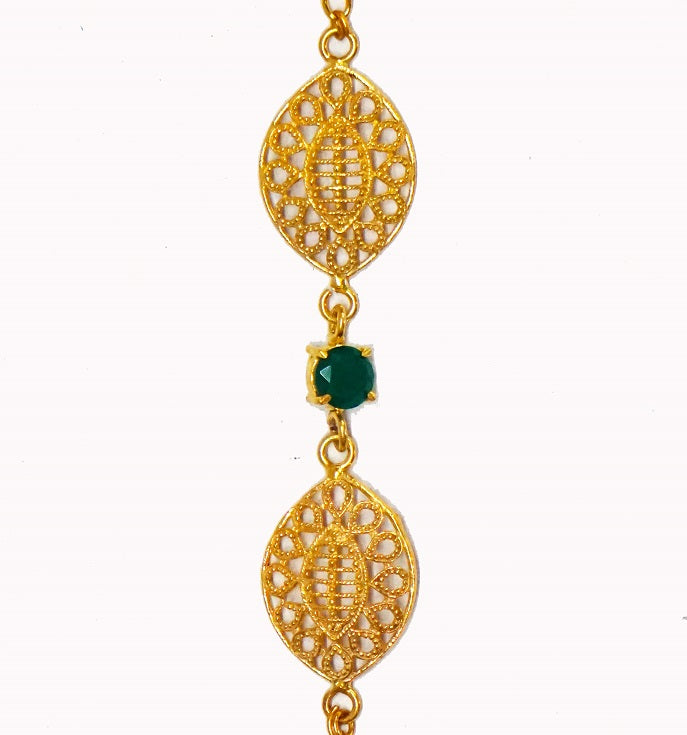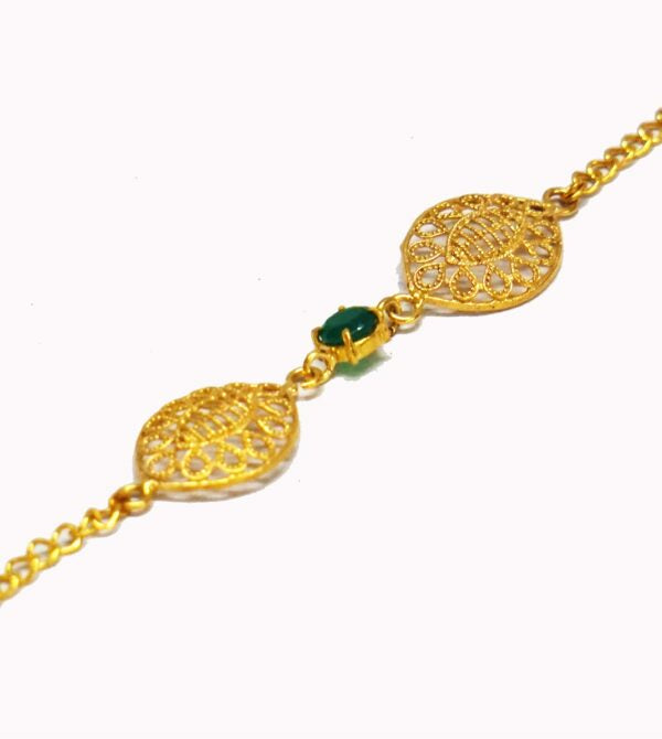 It’s a simple bracelet set with green imitation stone and motifs of filigree work around it.