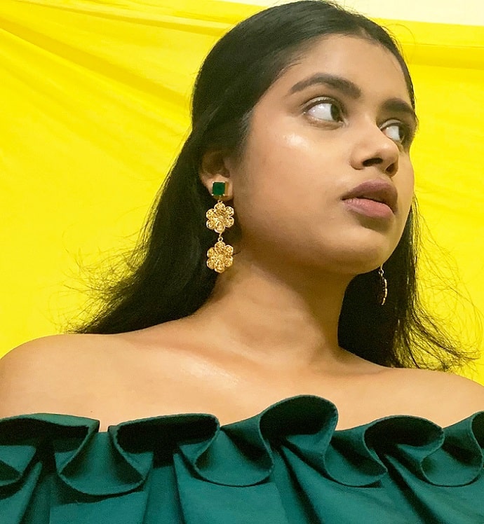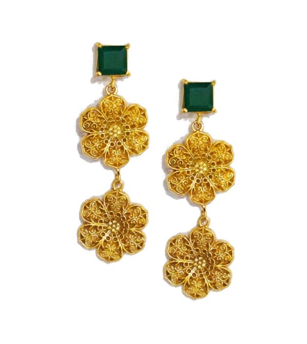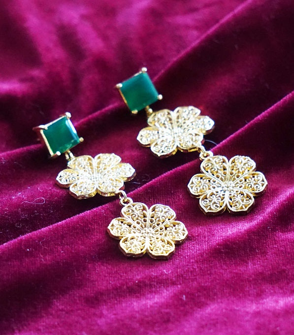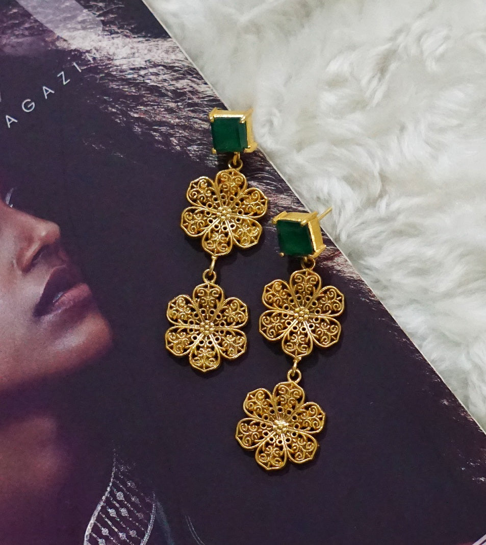 Embellished with a flower motif this dangler is handcrafted in brass. The greenstone top adds to the elegance.