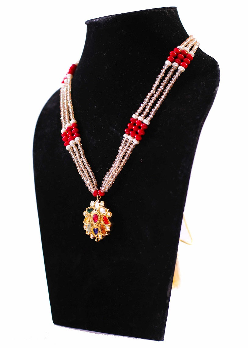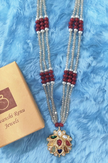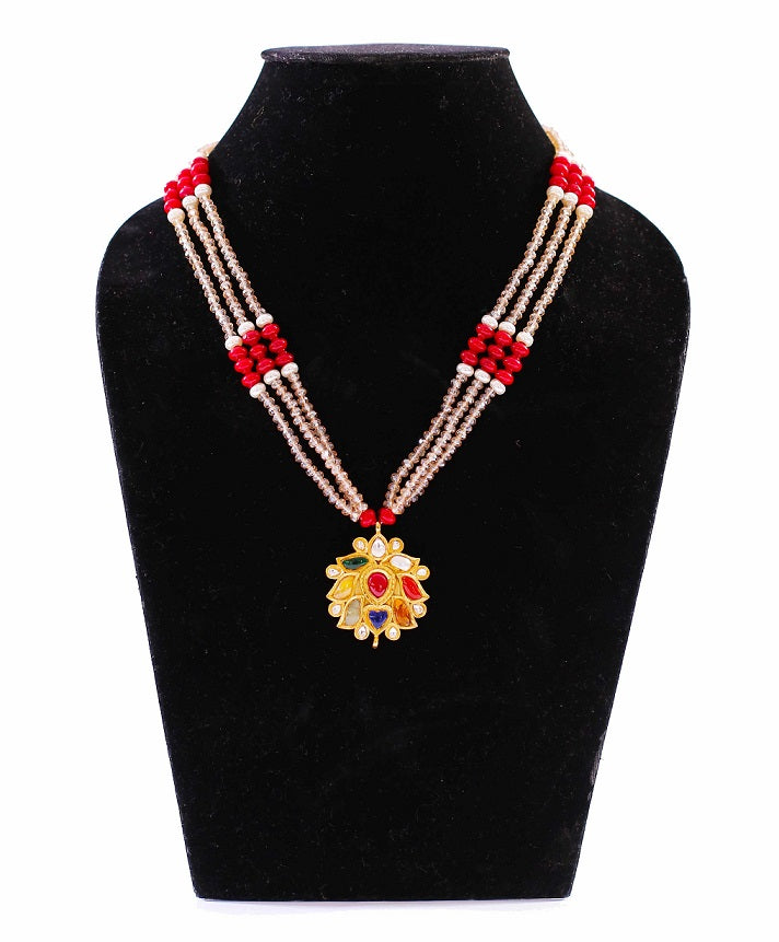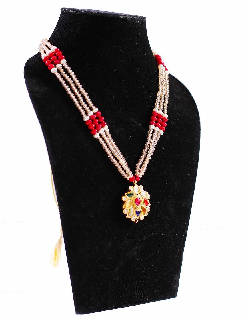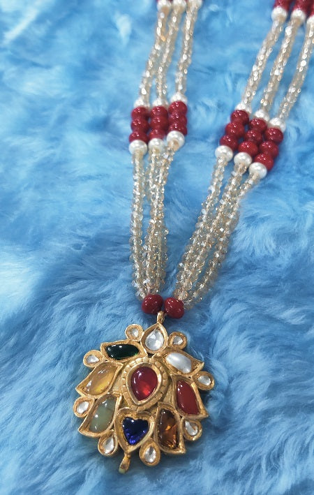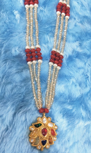 Handcrafted the typical Kundan work this Navratna beauty has all under one roof. The elegance of the shape and style is a compliment to the Citrine & Coral strings.