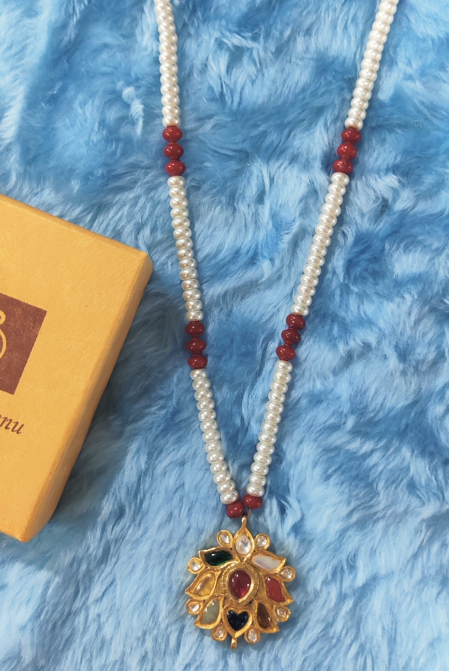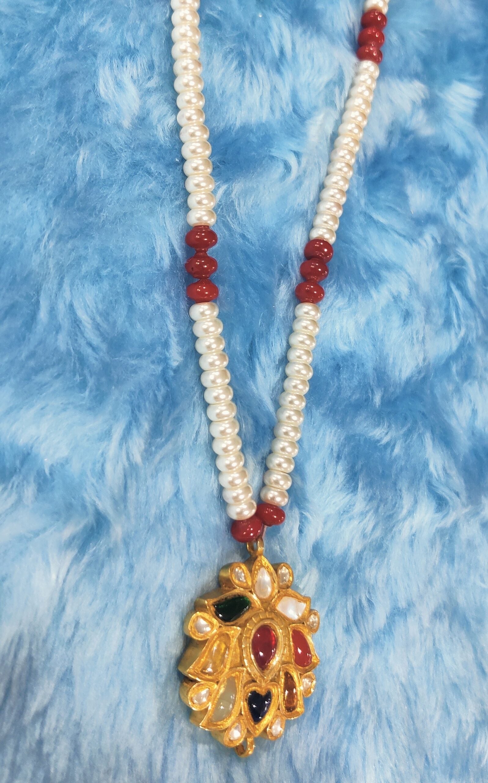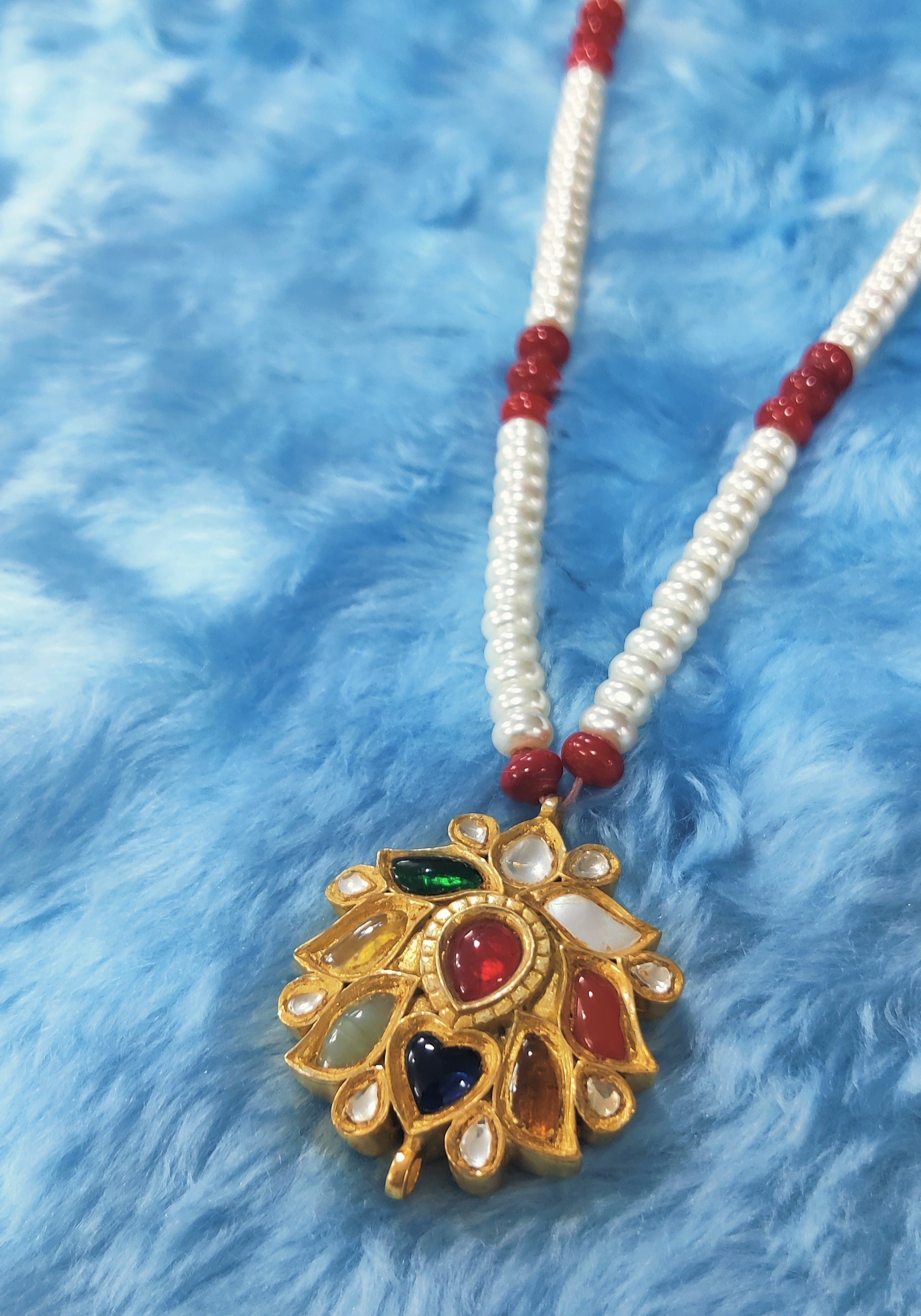 Handcrafted the typical Kundan work this Navratna beauty has all under one roof. The elegance of the shape and style is a compliment to the Pearl string.