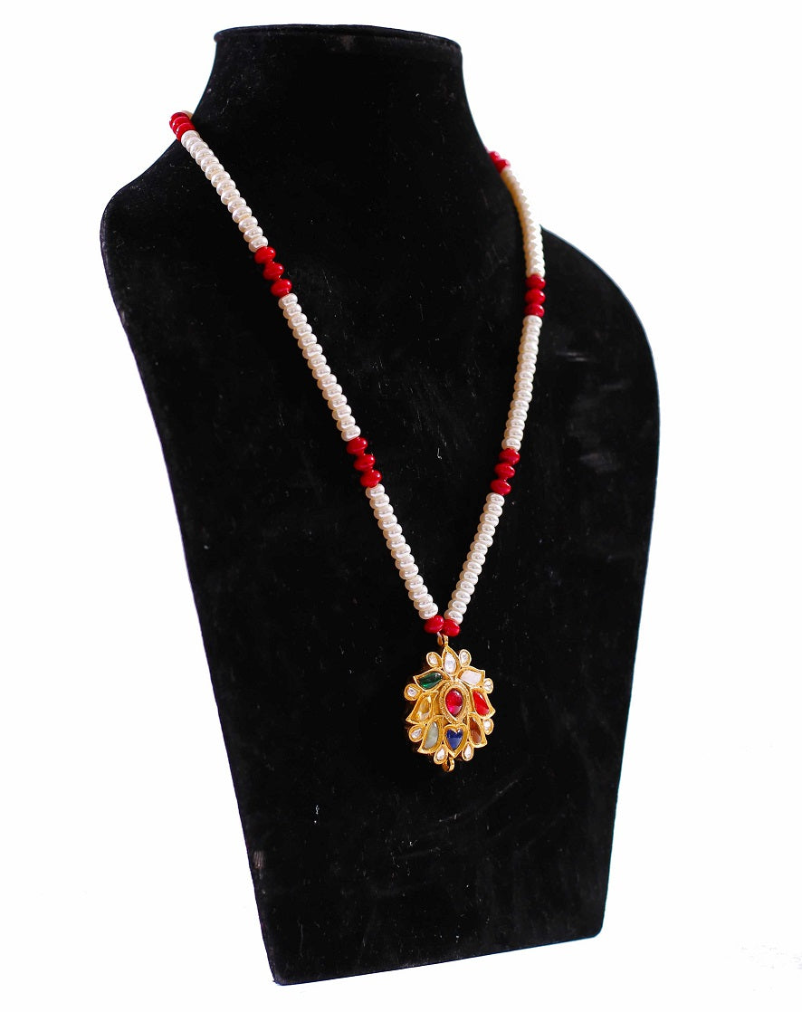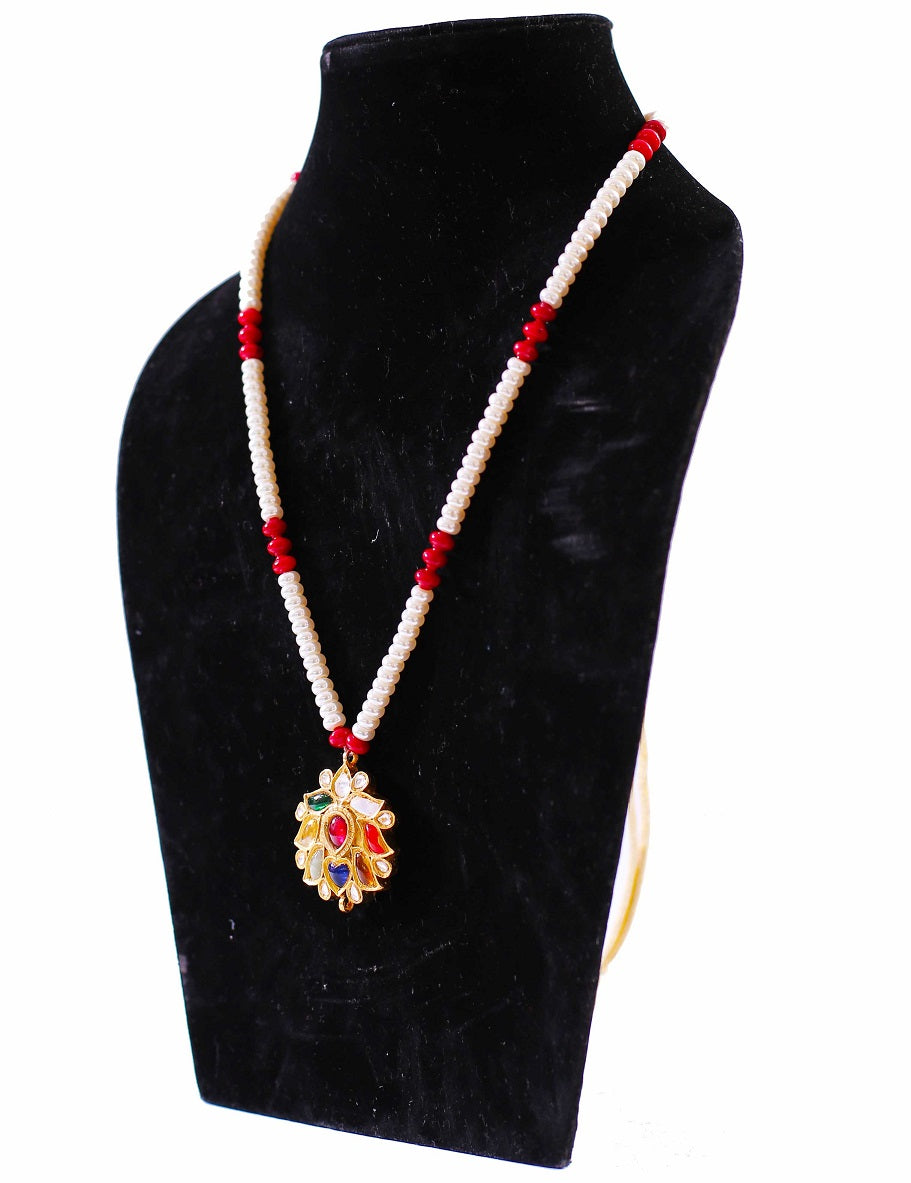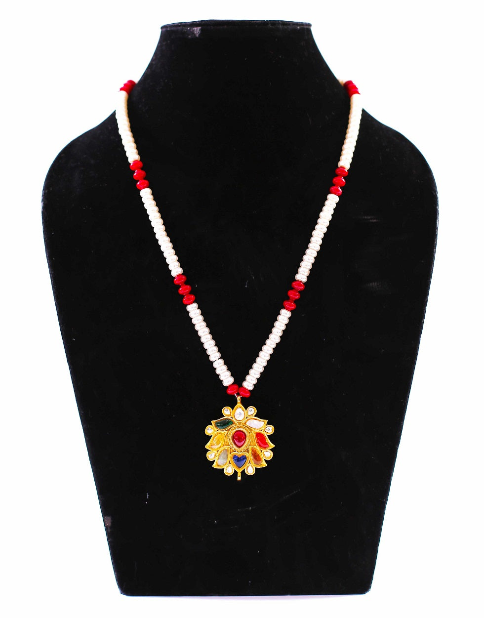 Handcrafted the typical Kundan work this Navratna beauty has all under one roof. The elegance of the shape and style is a compliment to the Pearl string.