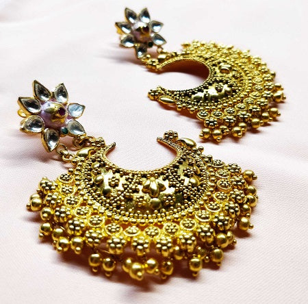 Handcrafted in Silver, this Temple earing is a pieces of art from the Pink City Set. Embellished with Imitation stones it is a high-class artistry.