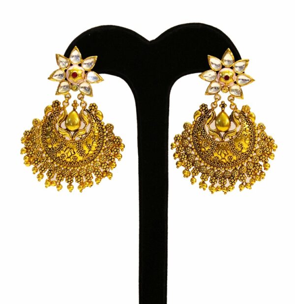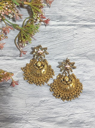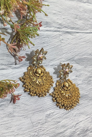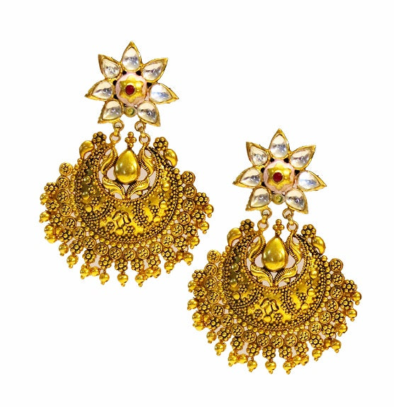 Handcrafted in Silver, this Temple earing is a pieces of art from the Pink City Set. Embellished with Imitation stones it is a high-class artistry.