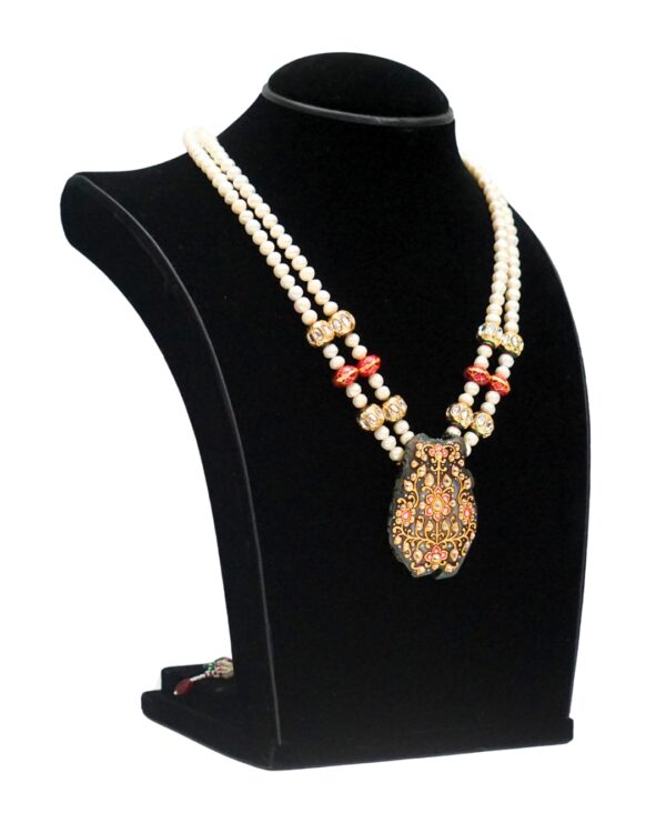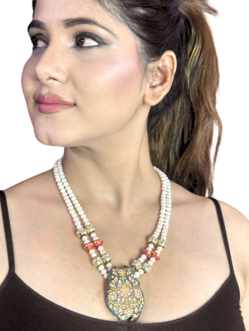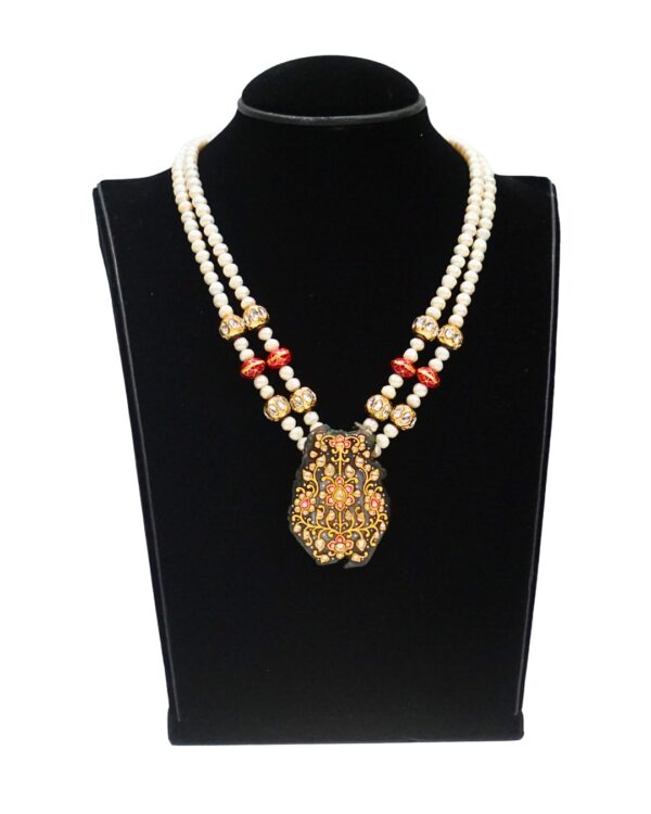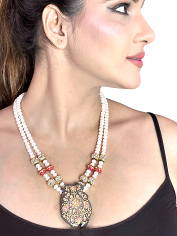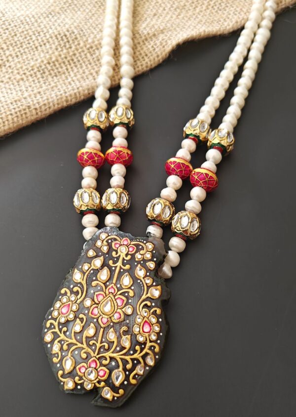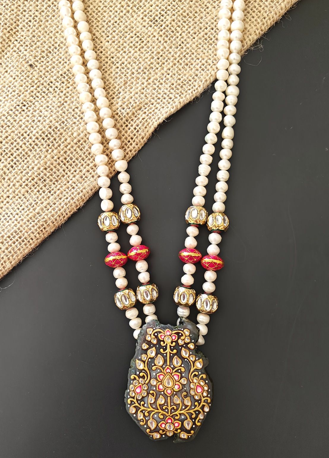 Encrusted with hand painted work Chalcedony stone is embellished with Pearls and Kundan Beads. The exquisite blend of colors makes it a must-have.