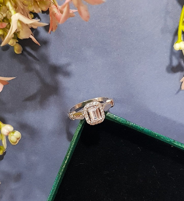 Embellished with imitation stones this Princess Cushion Cut Ring is a complete delight. Crafted in Silver it has a high class appeal.