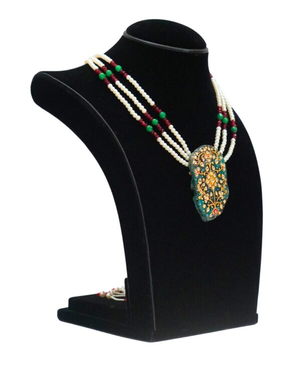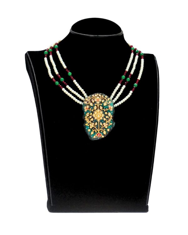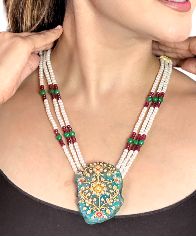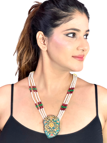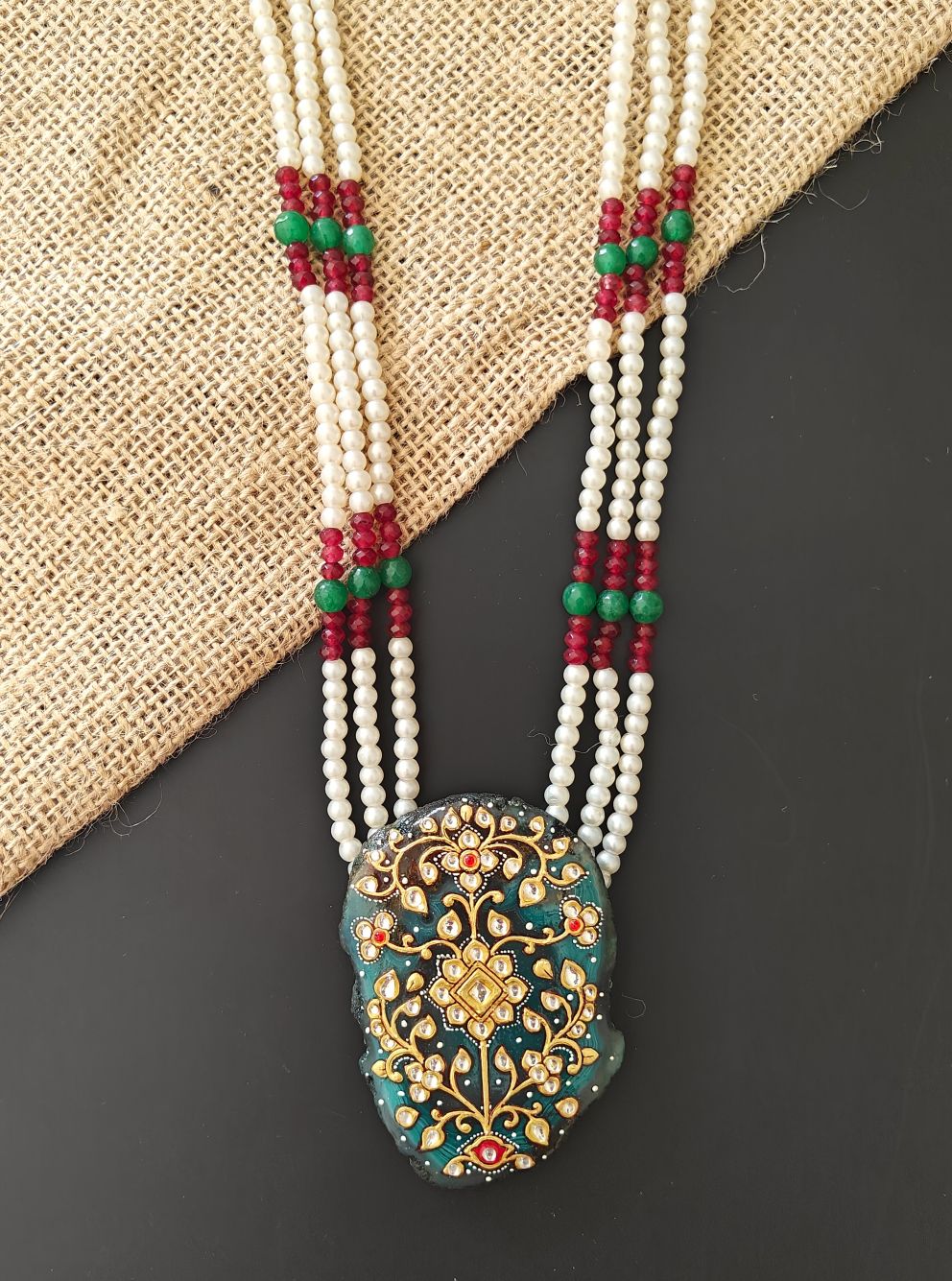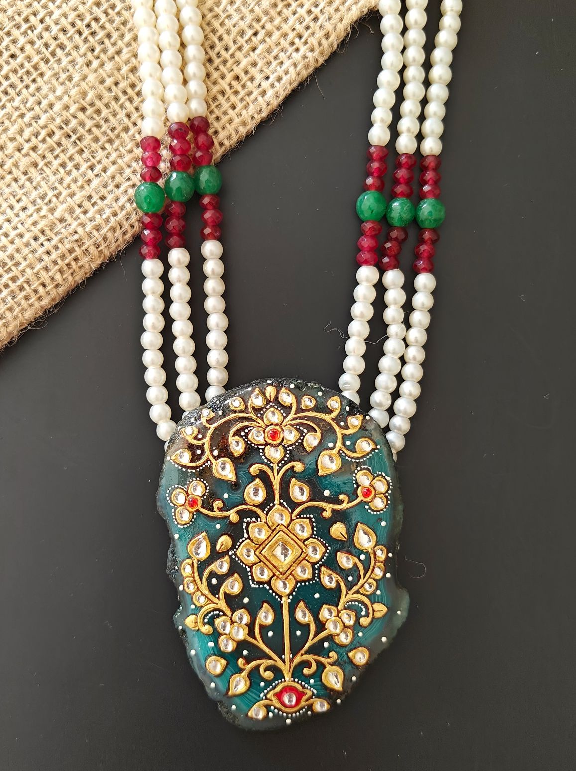 Encrusted with hand painted work Chalcedony stone is embellished with Pearls and Beads. The exquisite blend of colors makes it a must-have.