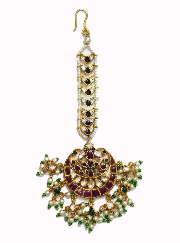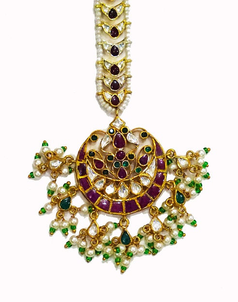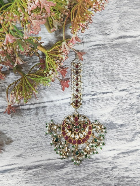 Embellished with the traditional kundan work, set in Silver this maang tikka has unusual blend of shape with Polki. The finishing of white polki makes it bridal.