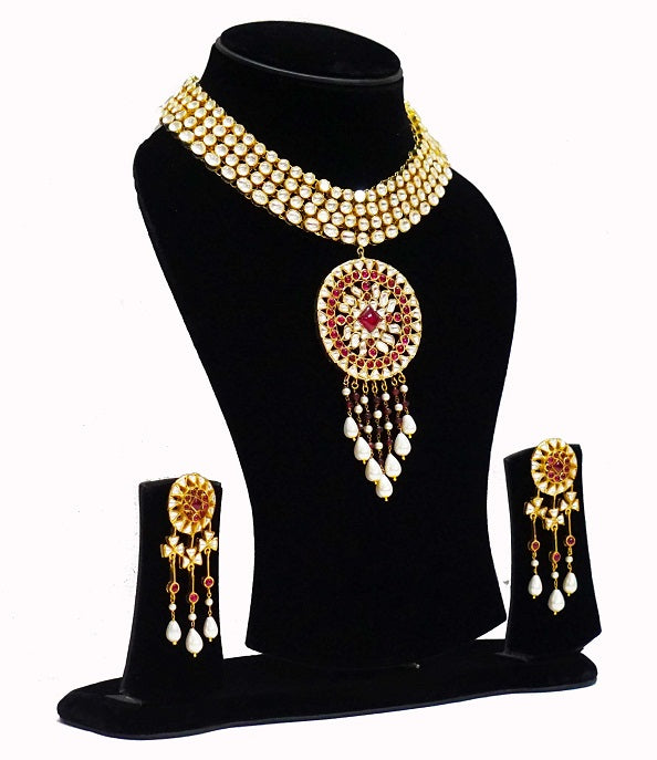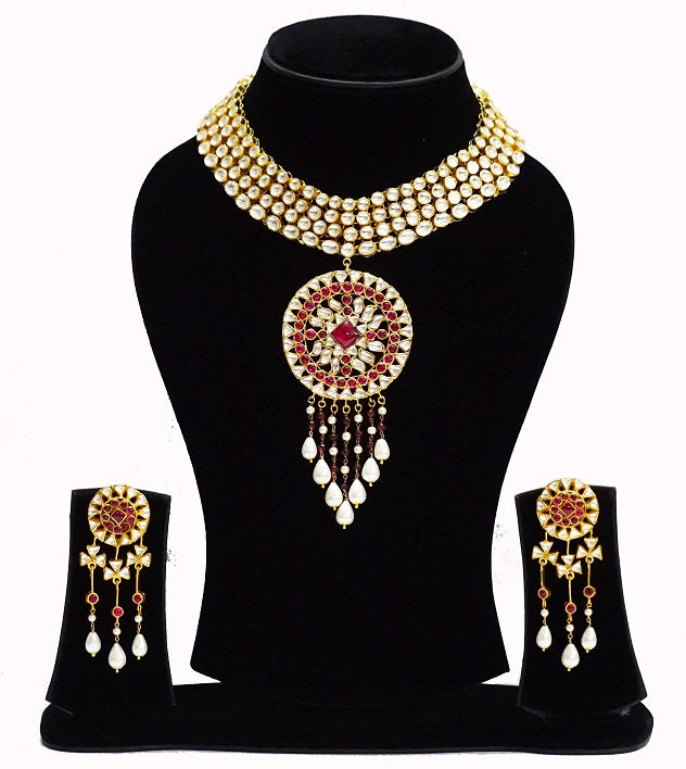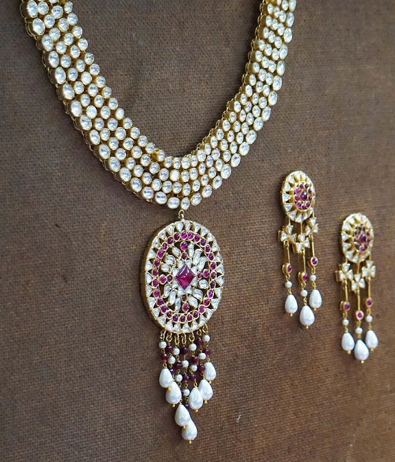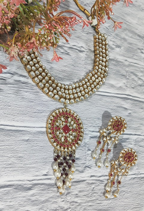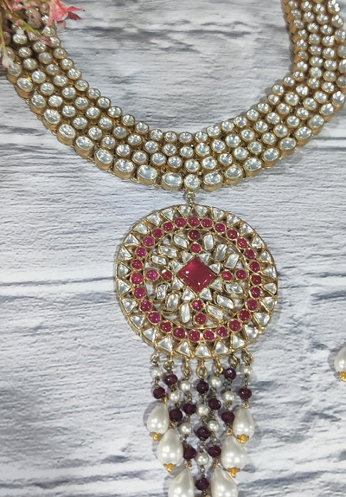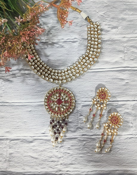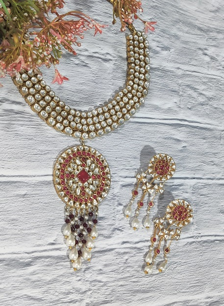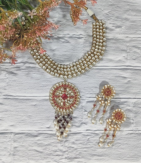 Simple yet exquisite this design has a beauty to it. The polki outline mixed with red imitation stone & strung with pearls makes it an irresistable piece aesthetically.