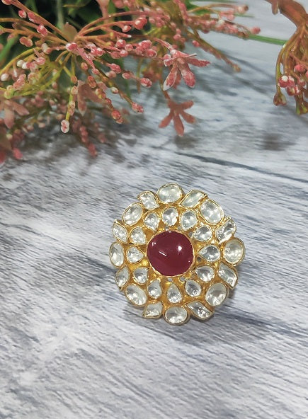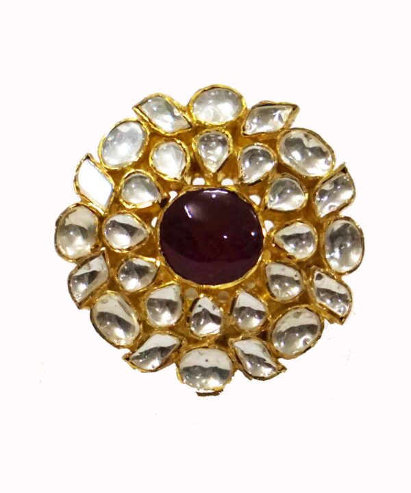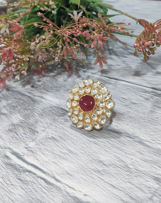 The brilliance of this Ring is the beautiful Red color complimenting the round shape and polki. A wedding trousseau cannot be complete without such a beauty.