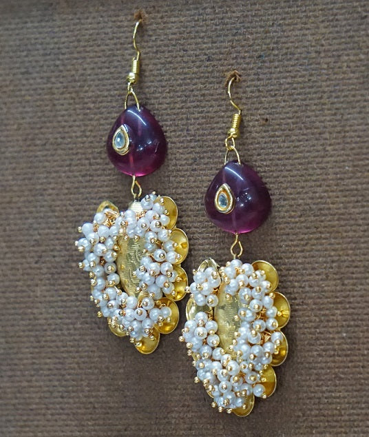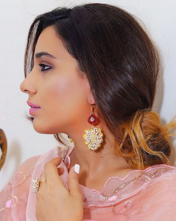 Handcrafted with embossing work, dangling red stone, and pearl work it is a complete earring.