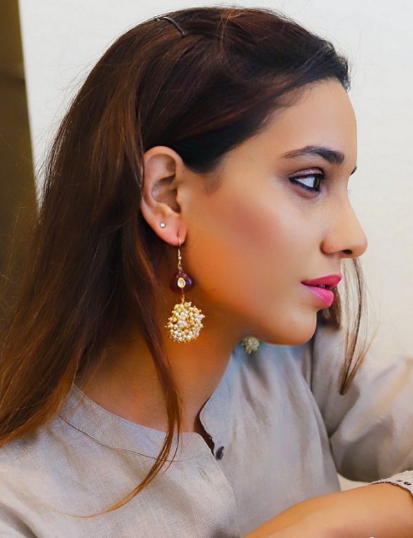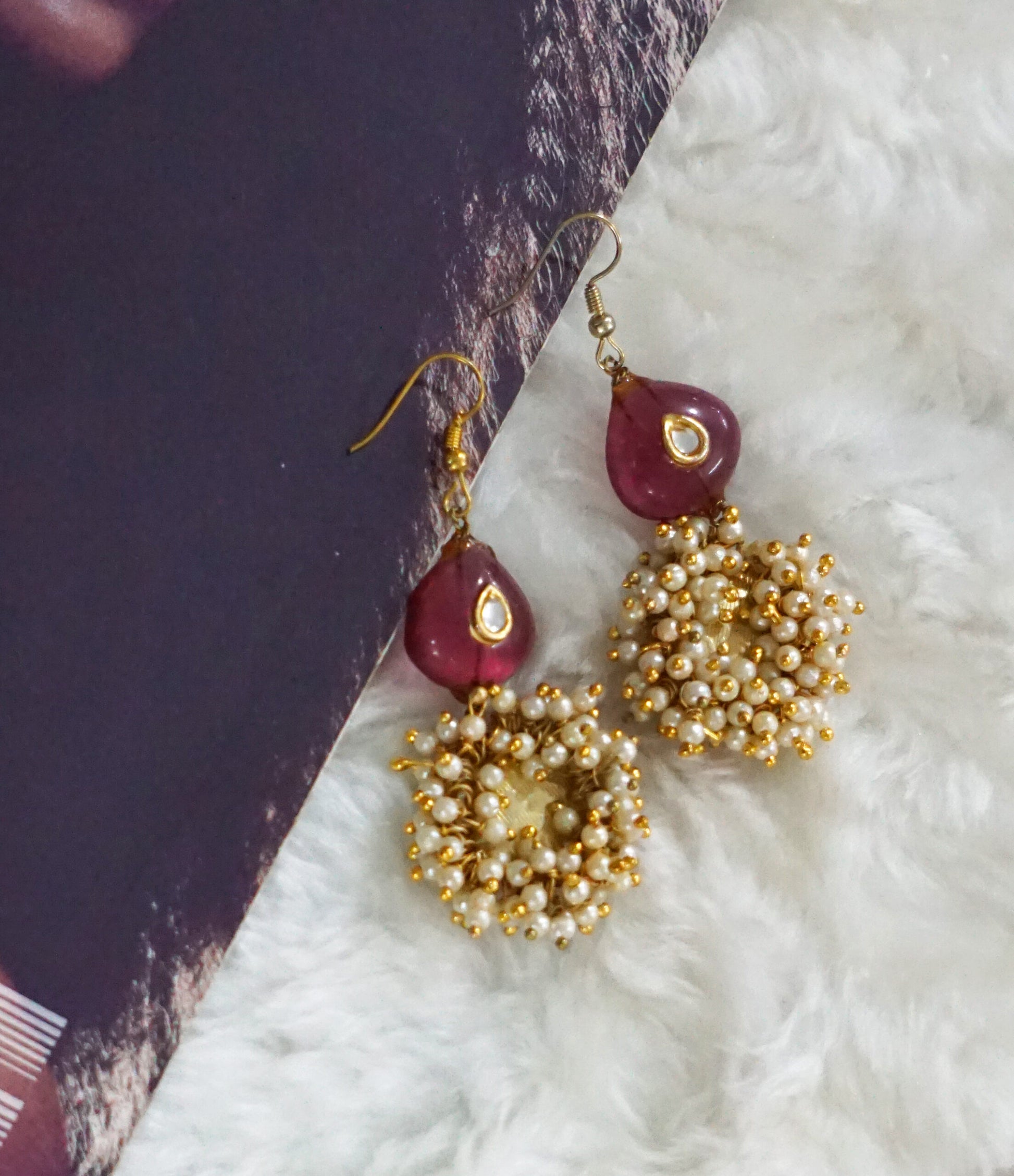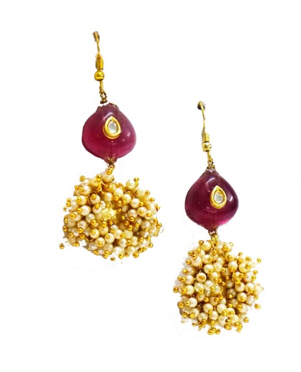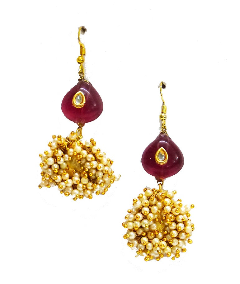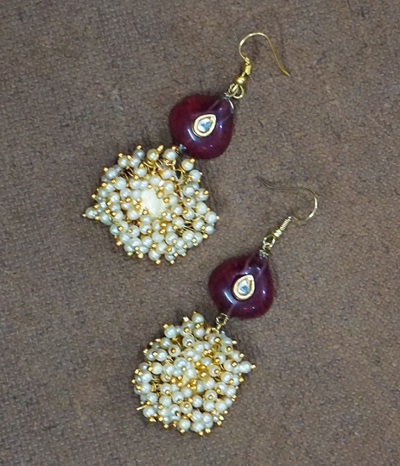 Handcrafted with embossing work, dangling red stone, and pearl work it is a complete earring.