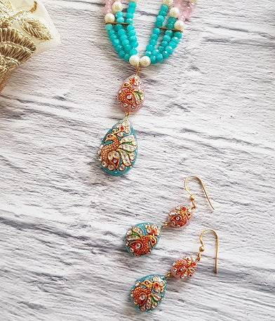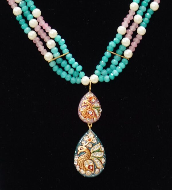Encrusted with hand painted work Rose Quartz & Aquamarine is set in Silver. The exquisite blend of colors makes it a must-have.