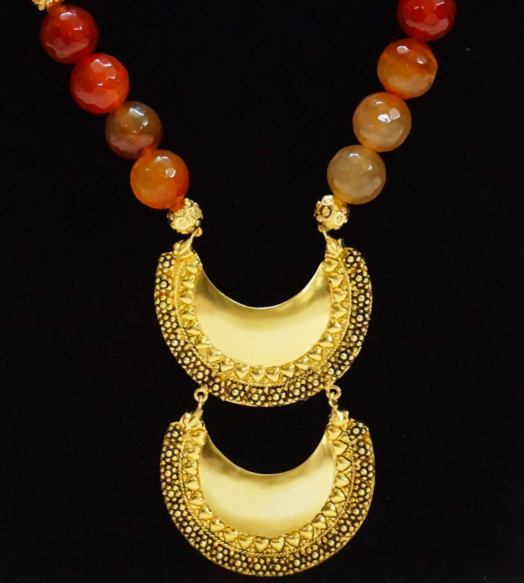 Layered temple style chandbali necklace done with imitation stone string and gold beads.