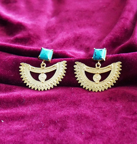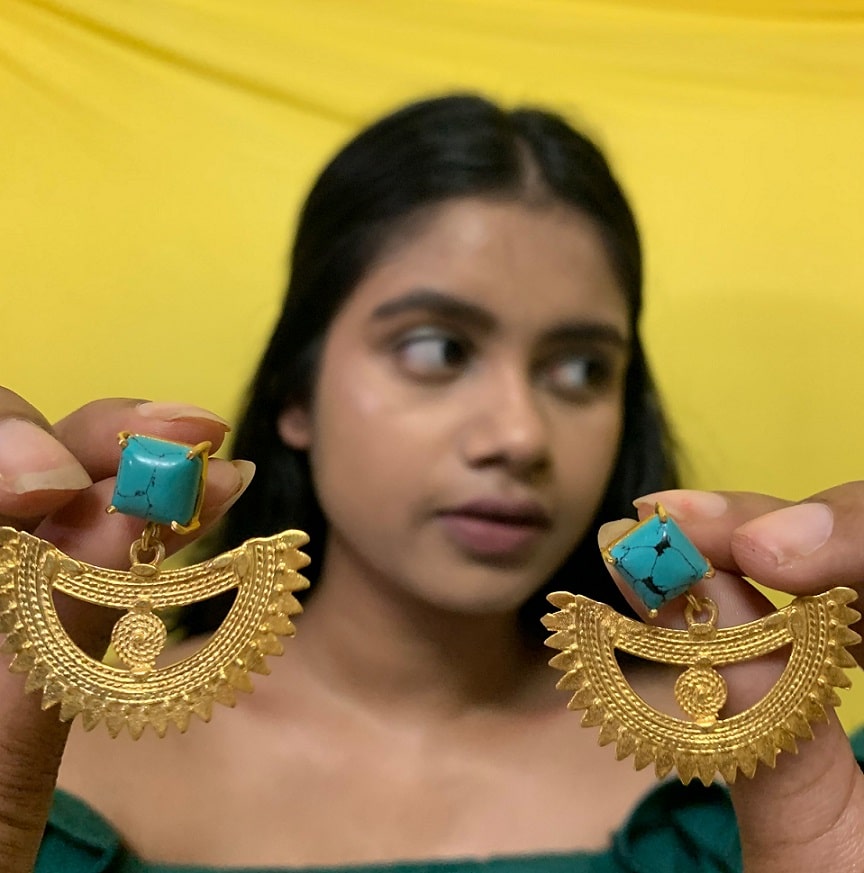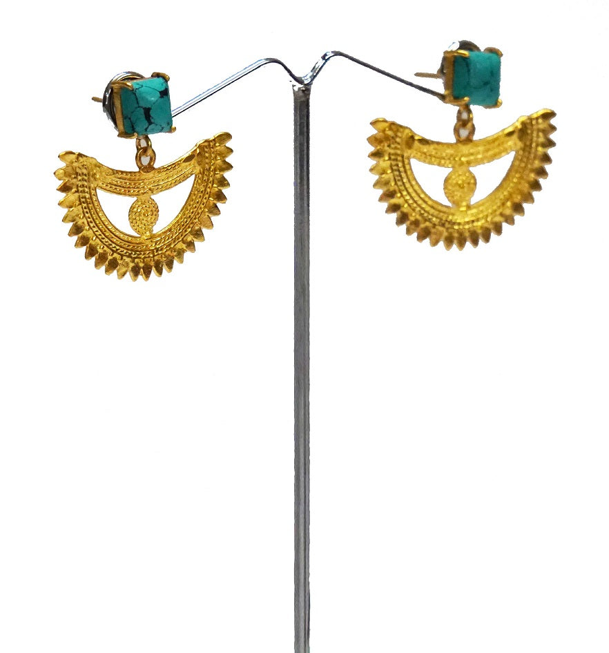 Turquoise stone set in brass and finished with dangling chandbali is elegant and classy.