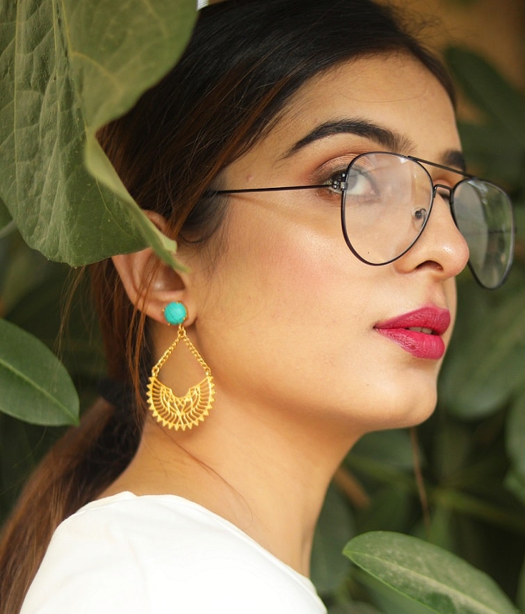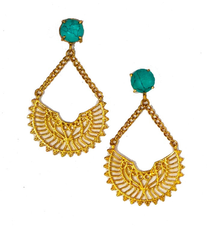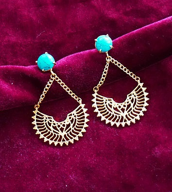 Turquoise stone set in brass and finished with dangling chandbali is elegant and classy.
