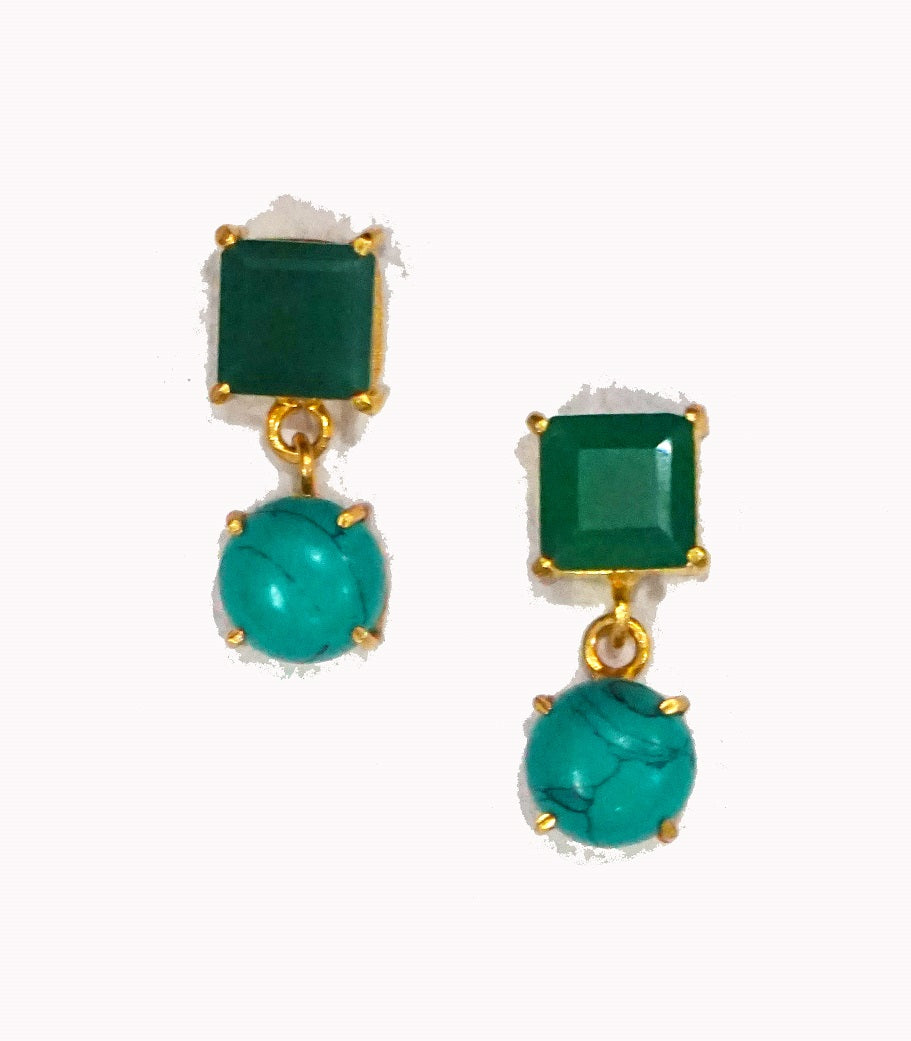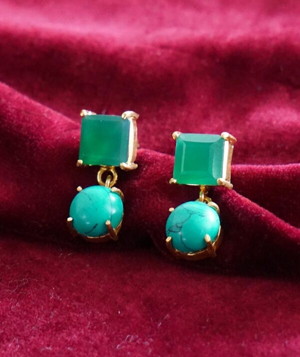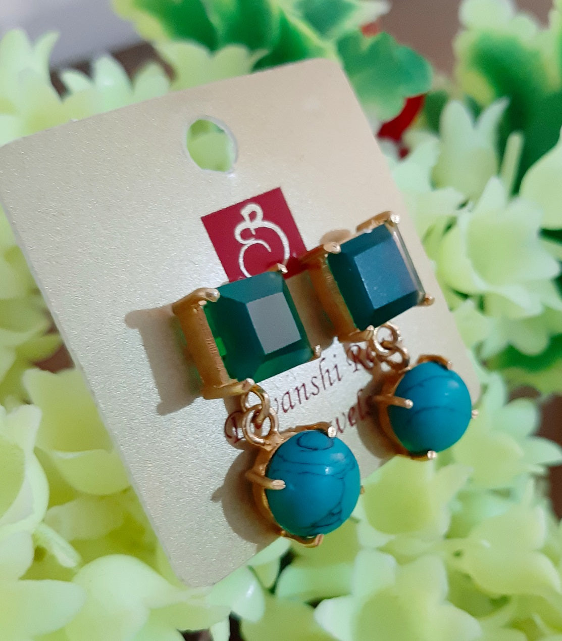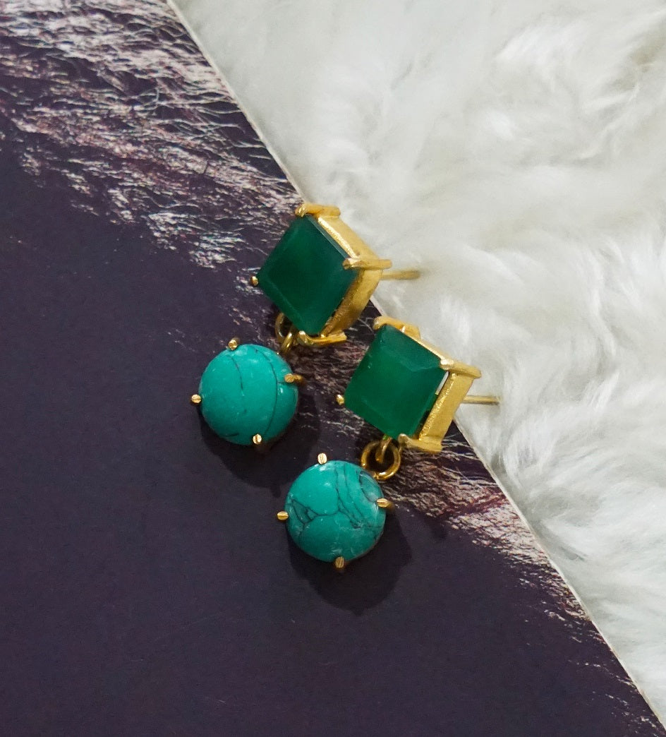 Simple yet elegant, Green stone top and dangling Turquoise stone are set in brass.