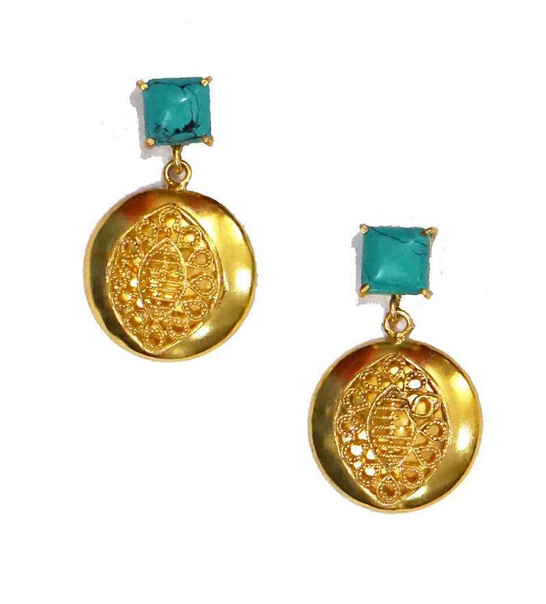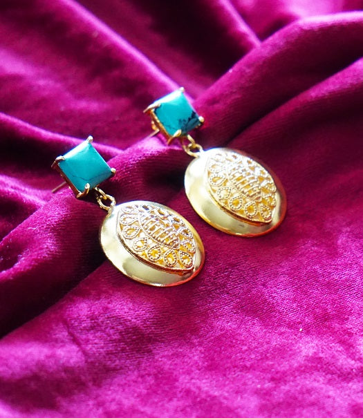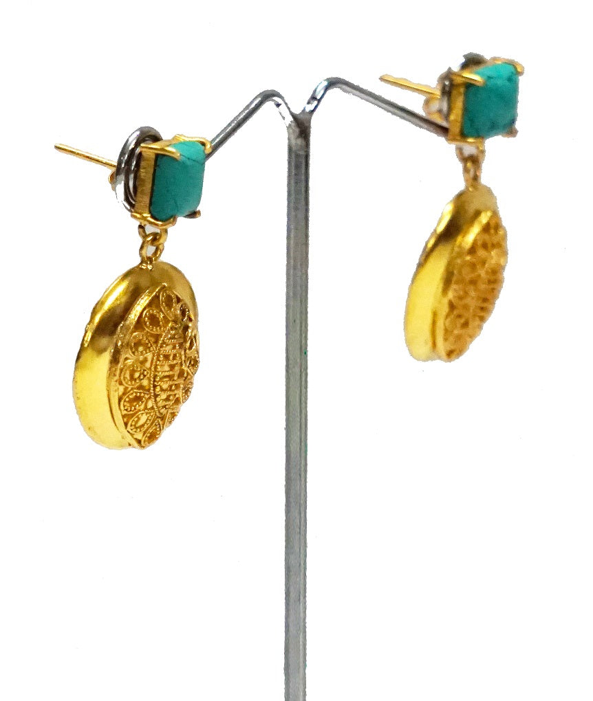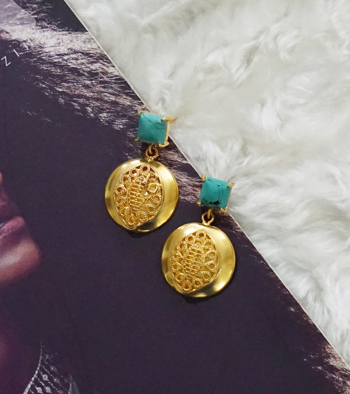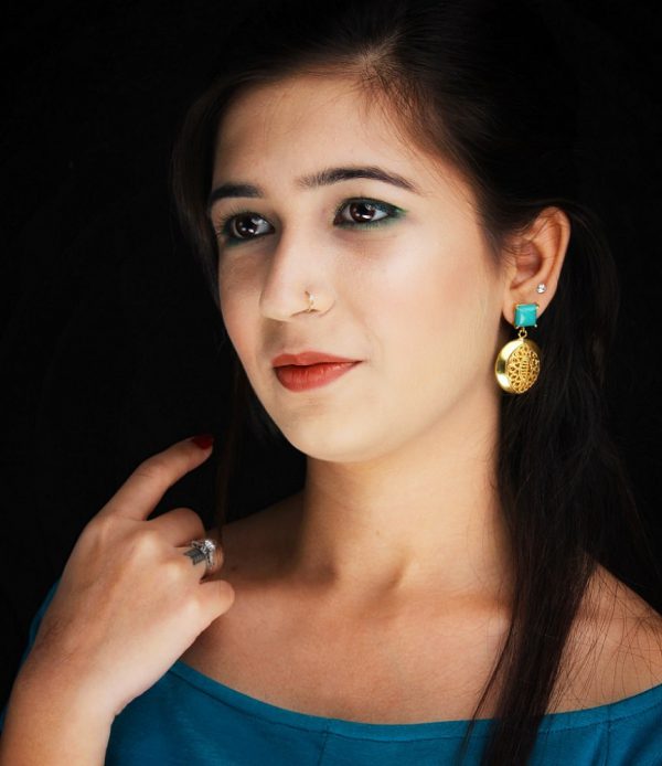 The Turquoise stone top with dangling flower motif is embellished with filigree work and handcrafted in brass.