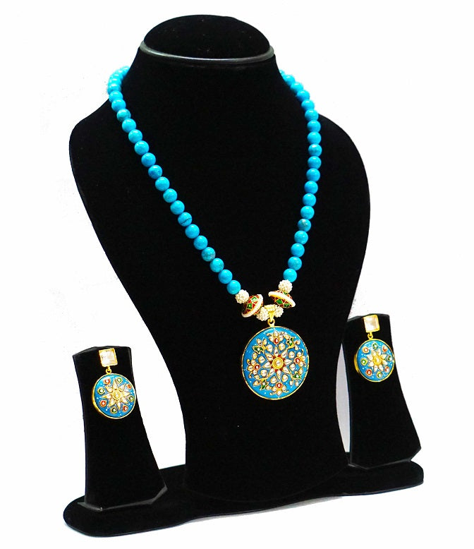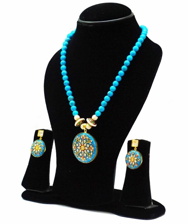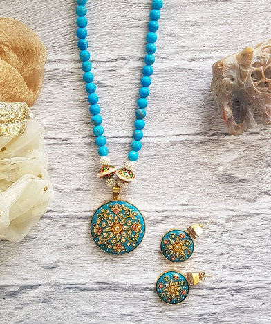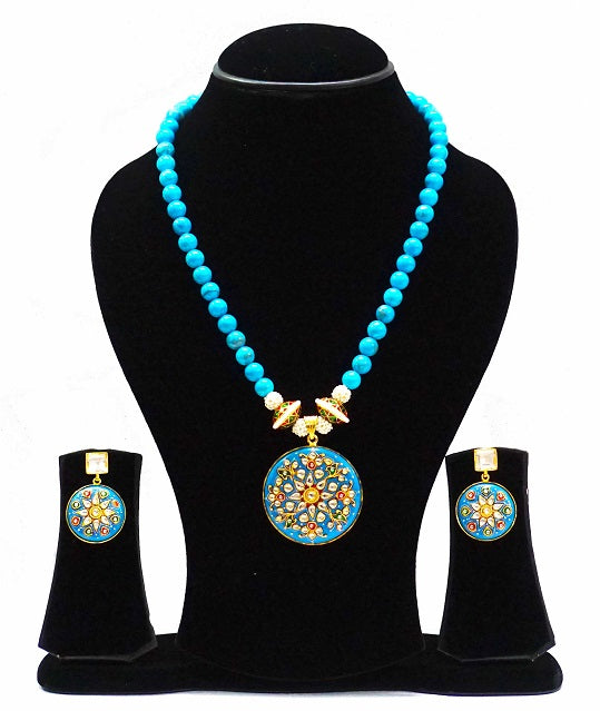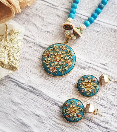Encrusted with hand painted work the Turquoise is set in Silver. The exquisite blend of colors makes it a must-have.