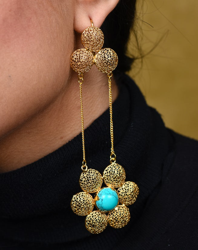 Elegant and stylish, this shoulder dust dangler is a very gorgeous piece if jewelry. Embellished with a Turquoise and flower motif it has a festive vibe.
